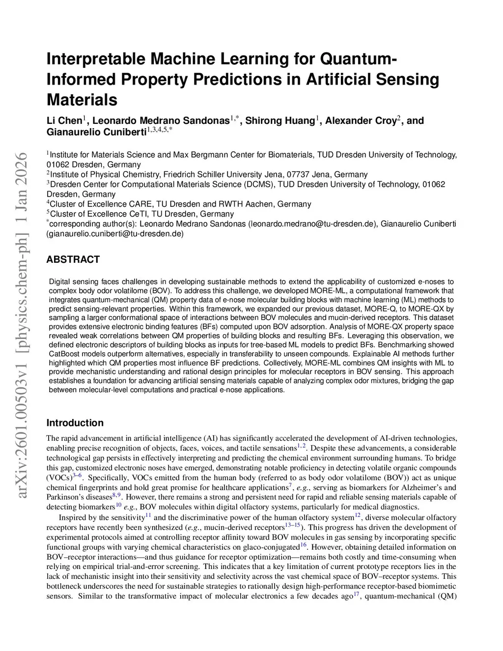 Digital sensing faces challenges in developing sustainable methods to extend the applicability of customized e-noses to complex body odor volatilome (BOV). To address this challenge, we developed MORE-ML, a computational framework that integrates quantum-mechanical (QM) property data of e-nose molecular building blocks with machine learning (ML) methods to predict sensing-relevant properties. Within this framework, we expanded our previous dataset, MORE-Q, to MORE-QX by sampling a larger conformational space of interactions between BOV molecules and mucin-derived receptors. This dataset provides extensive electronic binding features (BFs) computed upon BOV adsorption. Analysis of MORE-QX property space revealed weak correlations between QM properties of building blocks and resulting BFs. Leveraging this observation, we defined electronic descriptors of building blocks as inputs for tree-based ML models to predict BFs. Benchmarking showed CatBoost models outperform alternatives, especially in transferability to unseen compounds. Explainable AI methods further highlighted which QM properties most influence BF predictions. Collectively, MORE-ML combines QM insights with ML to provide mechanistic understanding and rational design principles for molecular receptors in BOV sensing. This approach establishes a foundation for advancing artificial sensing materials capable of analyzing complex odor mixtures, bridging the gap between molecular-level computations and practical e-nose applications.