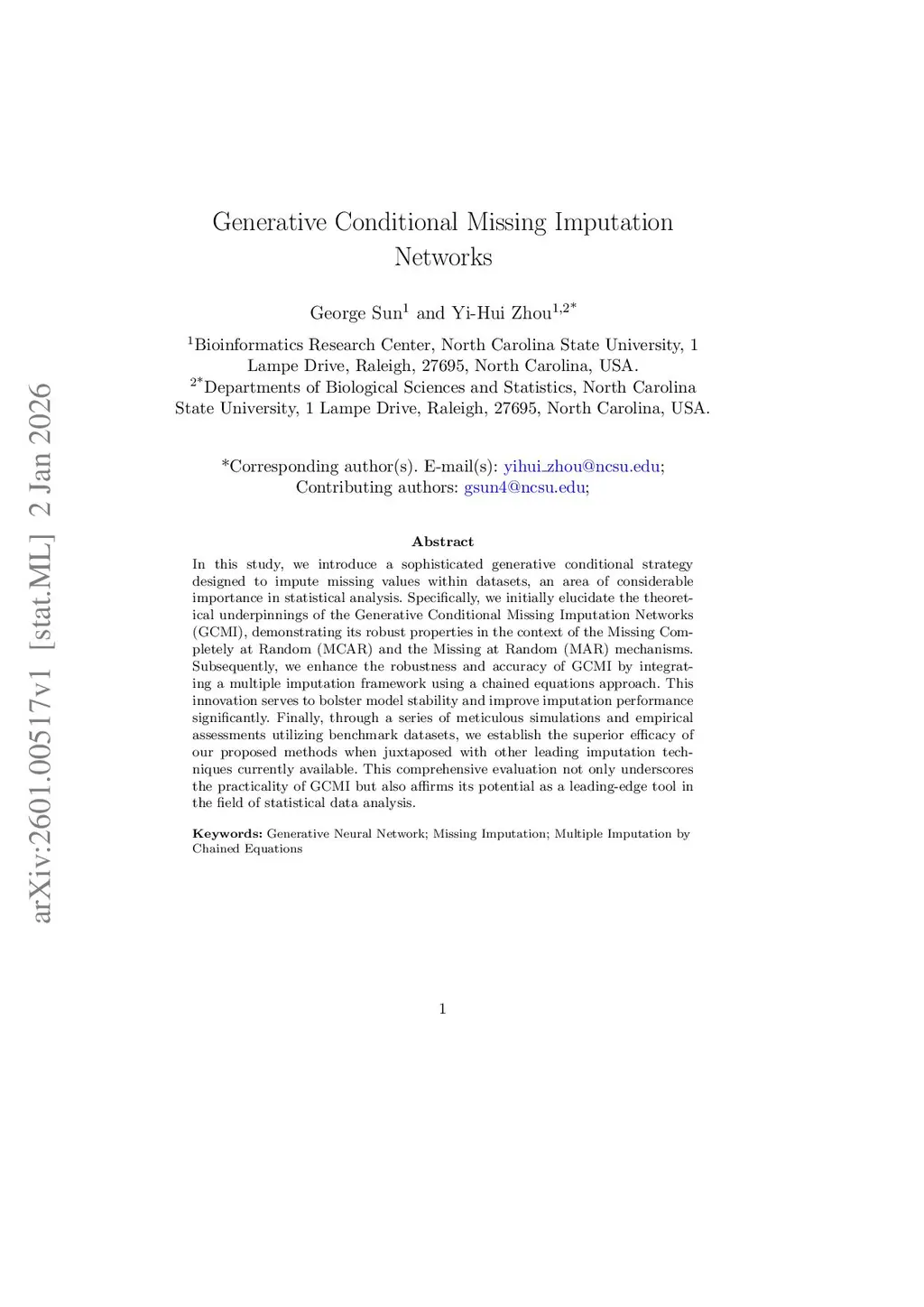 In this study, we introduce a sophisticated generative conditional strategy designed to impute missing values within datasets, an area of considerable importance in statistical analysis. Specifically, we initially elucidate the theoretical underpinnings of the Generative Conditional Missing Imputation Networks (GCMI), demonstrating its robust properties in the context of the Missing Completely at Random (MCAR) and the Missing at Random (MAR) mechanisms. Subsequently, we enhance the robustness and accuracy of GCMI by integrating a multiple imputation framework using a chained equations approach. This innovation serves to bolster model stability and improve imputation performance significantly. Finally, through a series of meticulous simulations and empirical assessments utilizing benchmark datasets, we establish the superior efficacy of our proposed methods when juxtaposed with other leading imputation techniques currently available. This comprehensive evaluation not only underscores the practicality of GCMI but also affirms its potential as a leading-edge tool in the field of statistical data analysis.