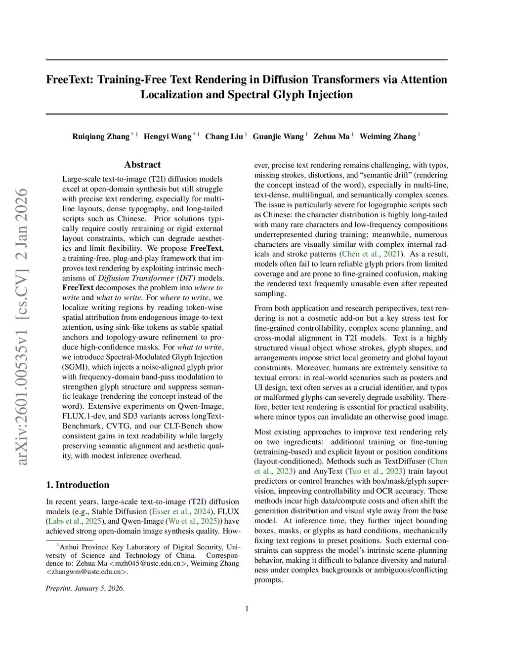 Large-scale text-to-image (T2I) diffusion models excel at open-domain synthesis but still struggle with precise text rendering, especially for multi-line layouts, dense typography, and long-tailed scripts such as Chinese. Prior solutions typically require costly retraining or rigid external layout constraints, which can degrade aesthetics and limit flexibility. We propose \textbf{FreeText}, a training-free, plug-and-play framework that improves text rendering by exploiting intrinsic mechanisms of \emph{Diffusion Transformer (DiT)} models. \textbf{FreeText} decomposes the problem into \emph{where to write} and \emph{what to write}. For \emph{where to write}, we localize writing regions by reading token-wise spatial attribution from endogenous image-to-text attention, using sink-like tokens as stable spatial anchors and topology-aware refinement to produce high-confidence masks. For \emph{what to write}, we introduce Spectral-Modulated Glyph Injection (SGMI), which injects a noise-aligned glyph prior with frequency-domain band-pass modulation to strengthen glyph structure and suppress semantic leakage (rendering the concept instead of the word). Extensive experiments on Qwen-Image, FLUX.1-dev, and SD3 variants across longText-Benchmark, CVTG, and our CLT-Bench show consistent gains in text readability while largely preserving semantic alignment and aesthetic quality, with modest inference overhead.