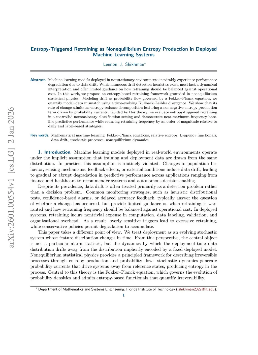 Machine learning models deployed in nonstationary environments inevitably experience performance degradation due to data drift. While numerous drift detection heuristics exist, most lack a dynamical interpretation and provide limited guidance on how retraining decisions should be balanced against operational cost. In this work, we propose an entropy-based retraining framework grounded in nonequilibrium statistical physics. Interpreting drift as probability flow governed by a Fokker-Planck equation, we quantify model-data mismatch using relative entropy and show that its time derivative admits an entropy-balance decomposition featuring a nonnegative entropy production term driven by probability currents. Guided by this theory, we implement an entropy-triggered retraining policy using an exponentially weighted moving-average (EWMA) control statistic applied to a streaming kernel density estimator of the Kullback-Leibler divergence. We evaluate this approach across multiple nonstationary data streams. In synthetic, financial, and web-traffic domains, entropy-based retraining achieves predictive performance comparable to frequent retraining while reducing retraining frequency by one to two orders of magnitude. However, in a challenging biomedical ECG setting, the entropy-based trigger underperforms the maximum-frequency baseline, highlighting limitations of feature-space entropy monitoring under complex label-conditional drift.