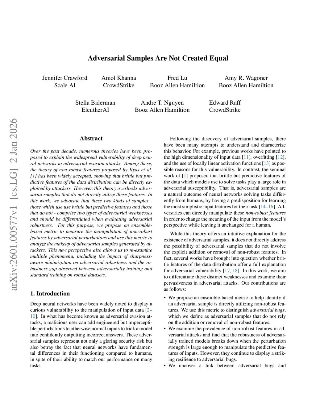 Over the past decade, numerous theories have been proposed to explain the widespread vulnerability of deep neural networks to adversarial evasion attacks. Among these, the theory of non-robust features proposed by Ilyas et al. has been widely accepted, showing that brittle but predictive features of the data distribution can be directly exploited by attackers. However, this theory overlooks adversarial samples that do not directly utilize these features. In this work, we advocate that these two kinds of samples - those which use use brittle but predictive features and those that do not - comprise two types of adversarial weaknesses and should be differentiated when evaluating adversarial robustness. For this purpose, we propose an ensemble-based metric to measure the manipulation of non-robust features by adversarial perturbations and use this metric to analyze the makeup of adversarial samples generated by attackers. This new perspective also allows us to re-examine multiple phenomena, including the impact of sharpness-aware minimization on adversarial robustness and the robustness gap observed between adversarially training and standard training on robust datasets.