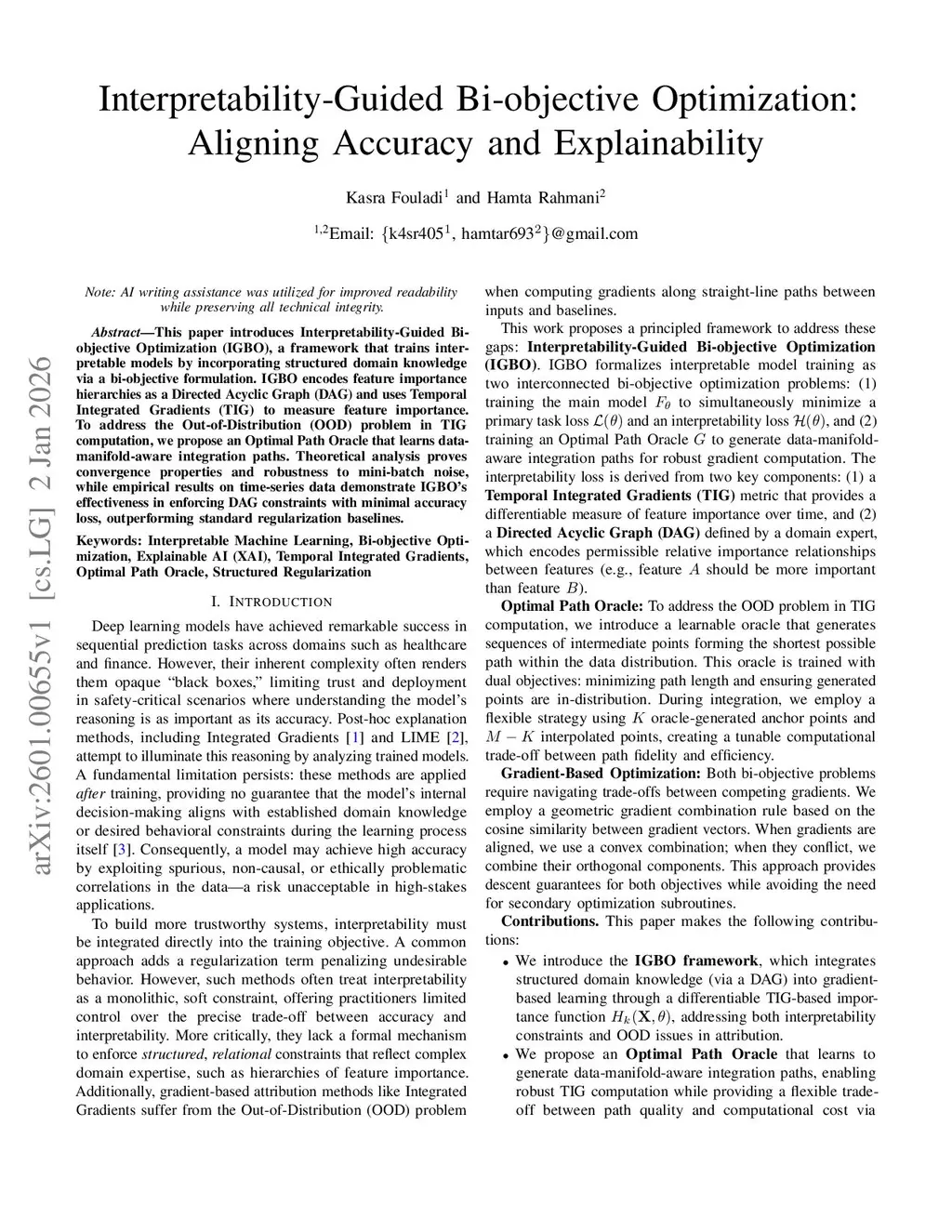 This paper introduces Interpretability-Guided Bi-objective Optimization (IGBO), a framework that trains interpretable models by incorporating structured domain knowledge via a bi-objective formulation. IGBO encodes feature importance hierarchies as a Directed Acyclic Graph (DAG) via Central Limit Theorem-based construction and uses Temporal Integrated Gradients (TIG) to measure feature importance. To address the Out-of-Distribution (OOD) problem in TIG computation, we propose an Optimal Path Oracle that learns data-manifold-aware integration paths. Theoretical analysis establishes convergence properties via a geometric projection mapping and proves robustness to mini-batch noise. Central Limit Theorem-based construction of the interpretability DAG ensures statistical validity of edge orientation decisions. Empirical results on time-series data demonstrate IGBO's effectiveness in enforcing DAG constraints with minimal accuracy loss, outperforming standard regularization baselines.