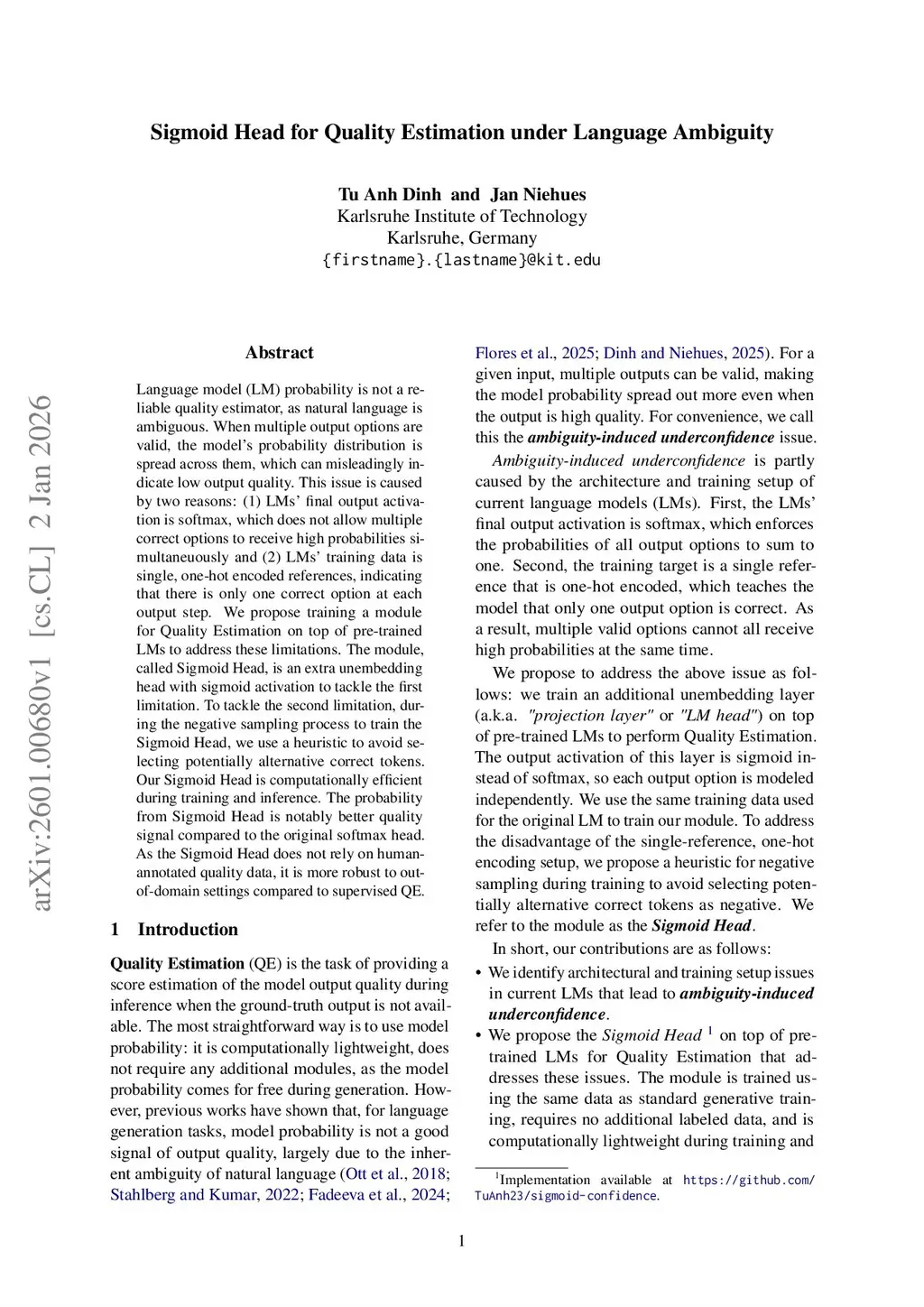 Sigmoid Head for Quality Estimation under Language Ambiguity