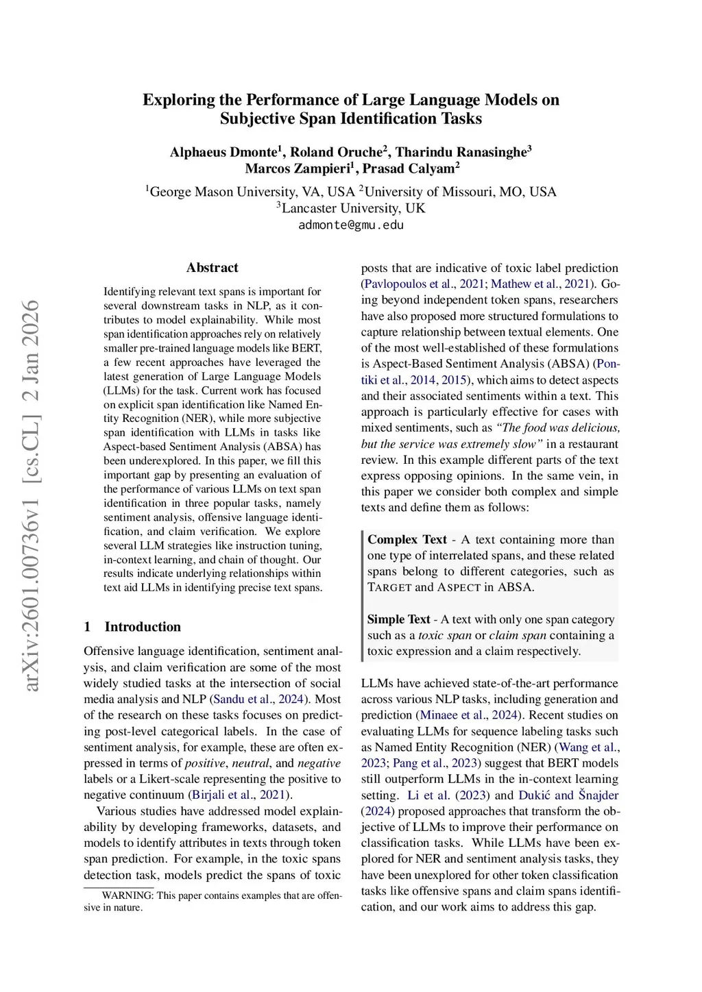 Exploring the Performance of Large Language Models on Subjective Span Identification Tasks