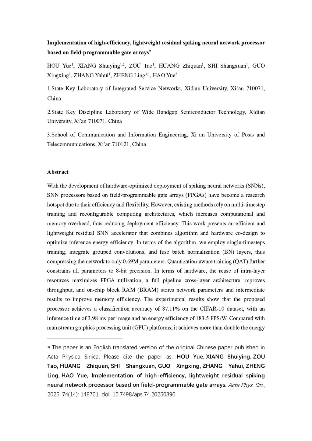 Implementation of high-efficiency, lightweight residual spiking neural network processor based on field-programmable gate arrays