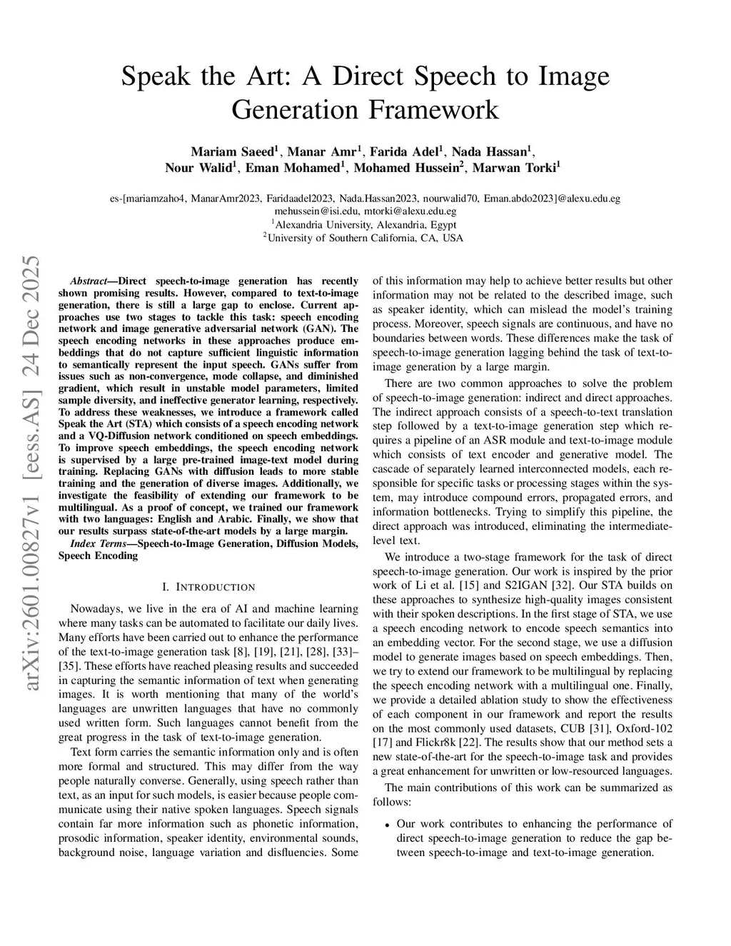 Direct speech-to-image generation has recently shown promising results. However, compared to text-to-image generation, there is still a large gap to enclose. Current approaches use two stages to tackle this task: speech encoding network and image generative adversarial network (GAN). The speech encoding networks in these approaches produce embeddings that do not capture sufficient linguistic information to semantically represent the input speech. GANs suffer from issues such as non-convergence, mode collapse, and diminished gradient, which result in unstable model parameters, limited sample diversity, and ineffective generator learning, respectively. To address these weaknesses, we introduce a framework called Speak the Art (STA) which consists of a speech encoding network and a VQ-Diffusion network conditioned on speech embeddings. To improve speech embeddings, the speech encoding network is supervised by a large pre-trained image-text model during training. Replacing GANs with diffusion leads to more stable training and the generation of diverse images. Additionally, we investigate the feasibility of extending our framework to be multilingual. As a proof of concept, we trained our framework with two languages: English and Arabic. Finally, we show that our results surpass state-of-the-art models by a large margin.