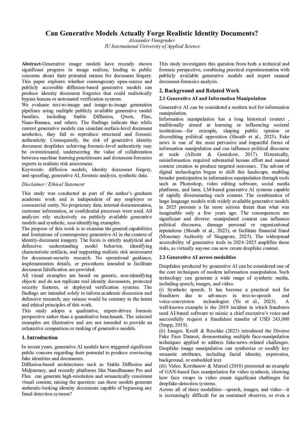 Generative image models have recently shown significant progress in image realism, leading to public concerns about their potential misuse for document forgery. This paper explores whether contemporary open-source and publicly accessible diffusion-based generative models can produce identity document forgeries that could realistically bypass human or automated verification systems. We evaluate text-to-image and image-to-image generation pipelines using multiple publicly available generative model families, including Stable Diffusion, Qwen, Flux, Nano-Banana, and others. The findings indicate that while current generative models can simulate surface-level document aesthetics, they fail to reproduce structural and forensic authenticity. Consequently, the risk of generative identity document deepfakes achieving forensic-level authenticity may be overestimated, underscoring the value of collaboration between machine learning practitioners and document-forensics experts in realistic risk assessment.