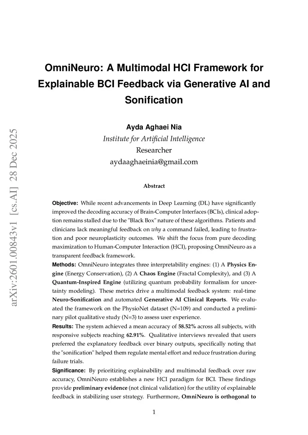While Deep Learning has improved Brain-Computer Interface (BCI) decoding accuracy, clinical adoption is hindered by the "Black Box" nature of these algorithms, leading to user frustration and poor neuroplasticity outcomes. We propose OmniNeuro, a novel HCI framework that transforms the BCI from a silent decoder into a transparent feedback partner. OmniNeuro integrates three interpretability engines: (1) Physics (Energy), (2) Chaos (Fractal Complexity), and (3) Quantum-Inspired uncertainty modeling. These metrics drive real-time Neuro-Sonification and Generative AI Clinical Reports. Evaluated on the PhysioNet dataset (), the system achieved a mean accuracy of 58.52%, with qualitative pilot studies () confirming that explainable feedback helps users regulate mental effort and reduces the "trial-and-error" phase. OmniNeuro is decoder-agnostic, acting as an essential interpretability layer for any state-of-the-art architecture.