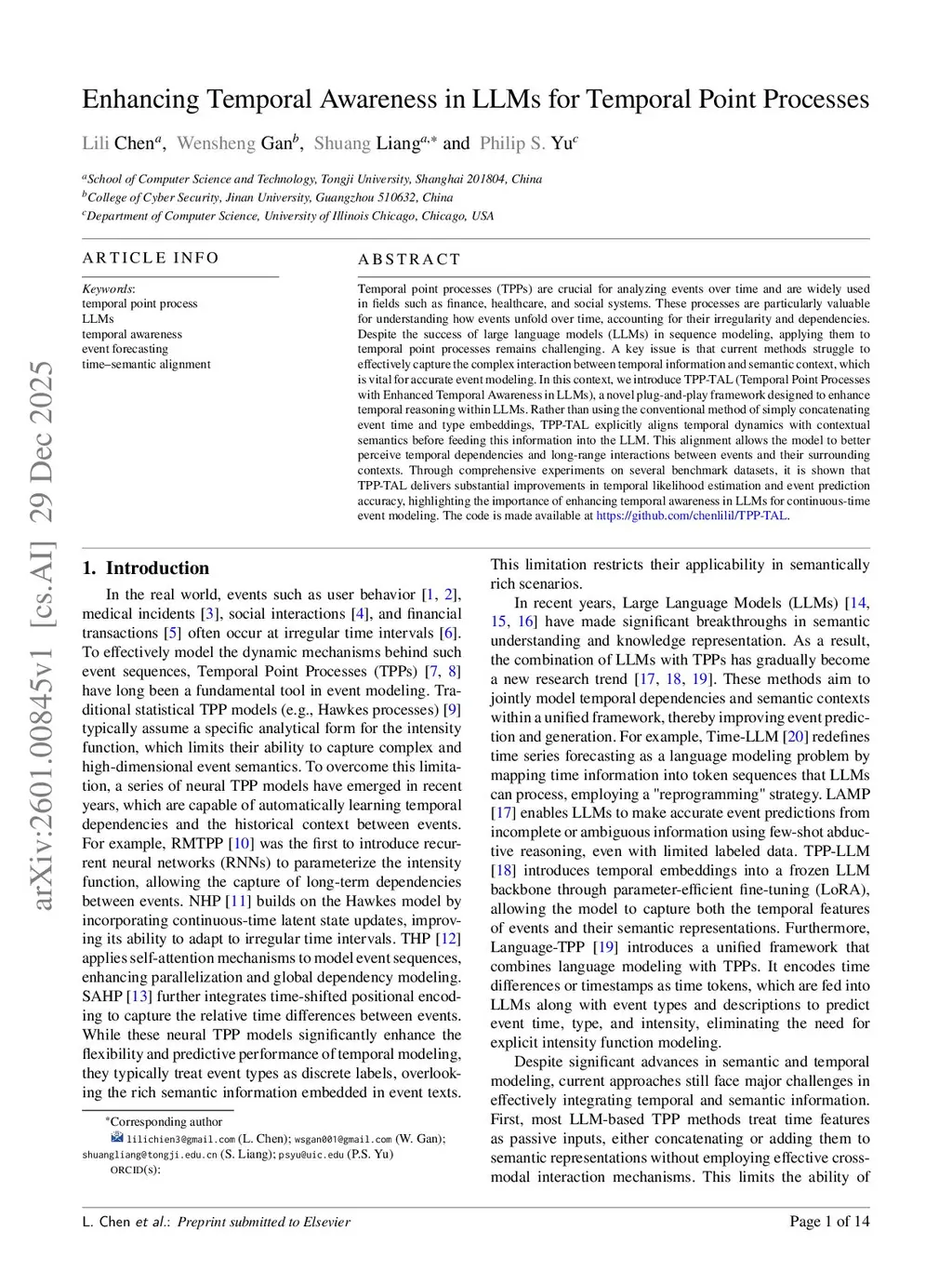 Temporal point processes (TPPs) are crucial for analyzing events over time and are widely used in fields such as finance, healthcare, and social systems. These processes are particularly valuable for understanding how events unfold over time, accounting for their irregularity and dependencies. Despite the success of large language models (LLMs) in sequence modeling, applying them to temporal point processes remains challenging. A key issue is that current methods struggle to effectively capture the complex interaction between temporal information and semantic context, which is vital for accurate event modeling. In this context, we introduce TPP-TAL (Temporal Point Processes with Enhanced Temporal Awareness in LLMs), a novel plug-and-play framework designed to enhance temporal reasoning within LLMs. Rather than using the conventional method of simply concatenating event time and type embeddings, TPP-TAL explicitly aligns temporal dynamics with contextual semantics before feeding this information into the LLM. This alignment allows the model to better perceive temporal dependencies and long-range interactions between events and their surrounding contexts. Through comprehensive experiments on several benchmark datasets, it is shown that TPP-TAL delivers substantial improvements in temporal likelihood estimation and event prediction accuracy, highlighting the importance of enhancing temporal awareness in LLMs for continuous-time event modeling. The code is made available atthis https URL