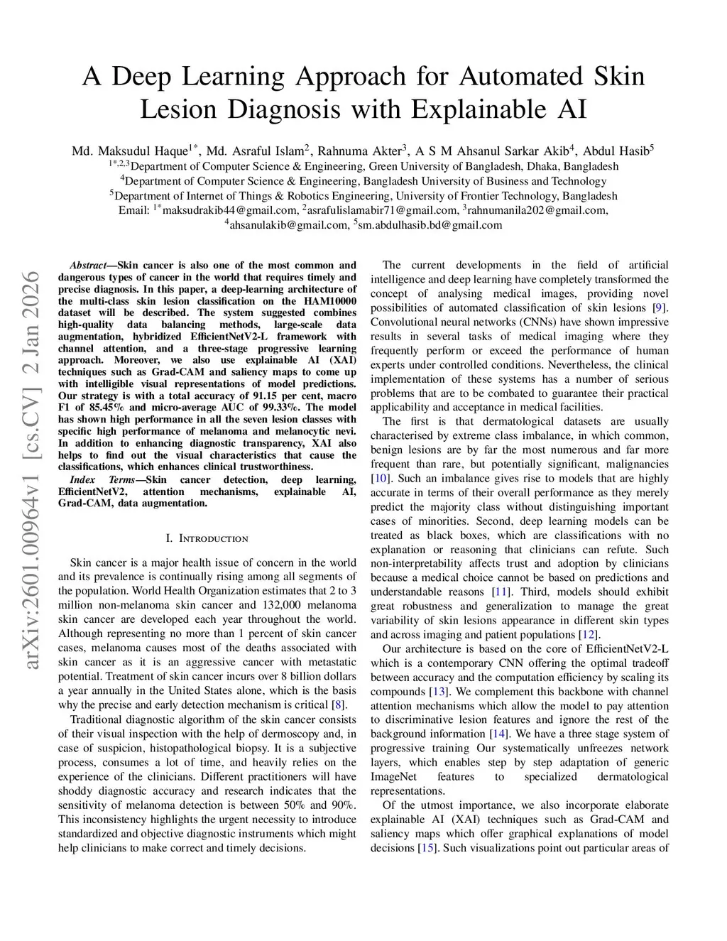 Skin cancer is also one of the most common and dangerous types of cancer in the world that requires timely and precise diagnosis. In this paper, a deep-learning architecture of the multi-class skin lesion classification on the HAM10000 dataset will be described. The system suggested combines high-quality data balancing methods, large-scale data augmentation, hybridized EfficientNetV2-L framework with channel attention, and a three-stage progressive learning approach. Moreover, we also use explainable AI (XAI) techniques such as Grad-CAM and saliency maps to come up with intelligible visual representations of model predictions. Our strategy is with a total accuracy of 91.15 per cent, macro F1 of 85.45\% and micro-average AUC of 99.33\%. The model has shown high performance in all the seven lesion classes with specific high performance of melanoma and melanocytic nevi. In addition to enhancing diagnostic transparency, XAI also helps to find out the visual characteristics that cause the classifications, which enhances clinical trustworthiness.