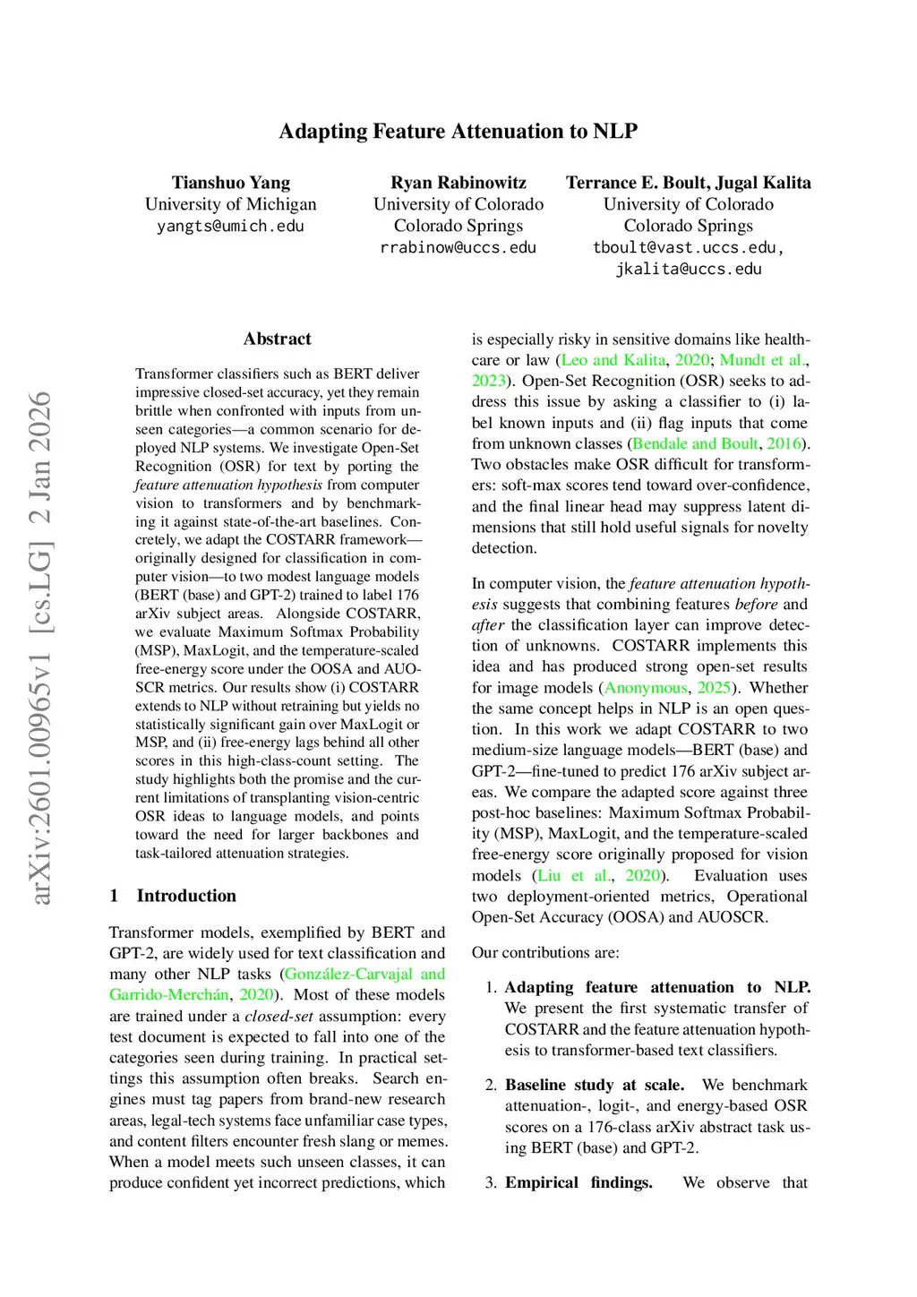 Transformer classifiers such as BERT deliver impressive closed-set accuracy, yet they remain brittle when confronted with inputs from unseen categories--a common scenario for deployed NLP systems. We investigate Open-Set Recognition (OSR) for text by porting the feature attenuation hypothesis from computer vision to transformers and by benchmarking it against state-of-the-art baselines. Concretely, we adapt the COSTARR framework--originally designed for classification in computer vision--to two modest language models (BERT (base) and GPT-2) trained to label 176 arXiv subject areas. Alongside COSTARR, we evaluate Maximum Softmax Probability (MSP), MaxLogit, and the temperature-scaled free-energy score under the OOSA and AUOSCR metrics. Our results show (i) COSTARR extends to NLP without retraining but yields no statistically significant gain over MaxLogit or MSP, and (ii) free-energy lags behind all other scores in this high-class-count setting. The study highlights both the promise and the current limitations of transplanting vision-centric OSR ideas to language models, and points toward the need for larger backbones and task-tailored attenuation strategies.