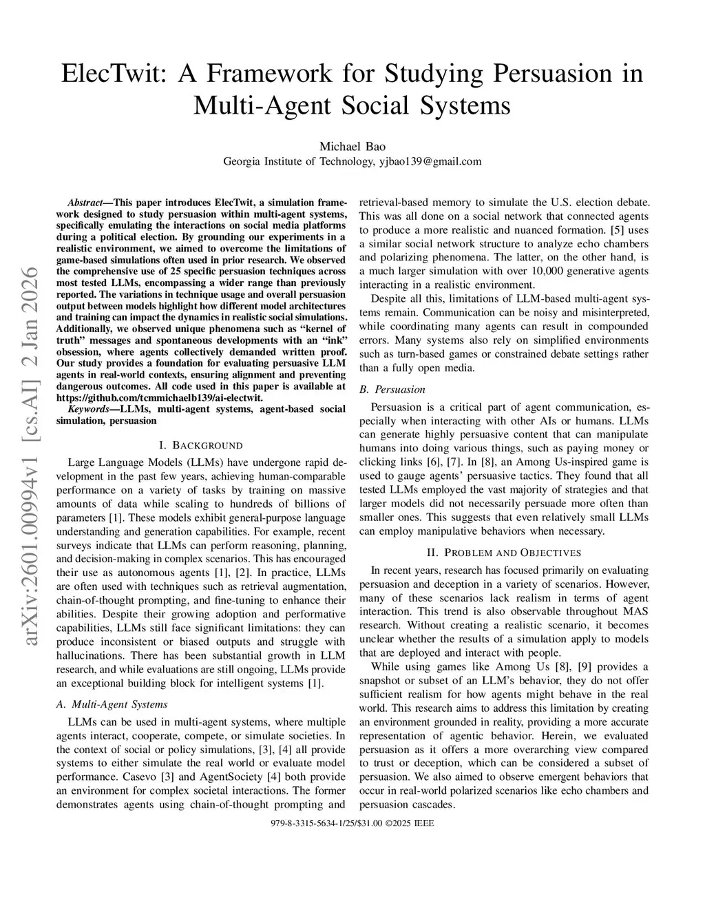This paper introduces ElecTwit, a simulation framework designed to study persuasion within multi-agent systems, specifically emulating the interactions on social media platforms during a political election. By grounding our experiments in a realistic environment, we aimed to overcome the limitations of game-based simulations often used in prior research. We observed the comprehensive use of 25 specific persuasion techniques across most tested LLMs, encompassing a wider range than previously reported. The variations in technique usage and overall persuasion output between models highlight how different model architectures and training can impact the dynamics in realistic social simulations. Additionally, we observed unique phenomena such as "kernel of truth" messages and spontaneous developments with an "ink" obsession, where agents collectively demanded written proof. Our study provides a foundation for evaluating persuasive LLM agents in real-world contexts, ensuring alignment and preventing dangerous outcomes.
