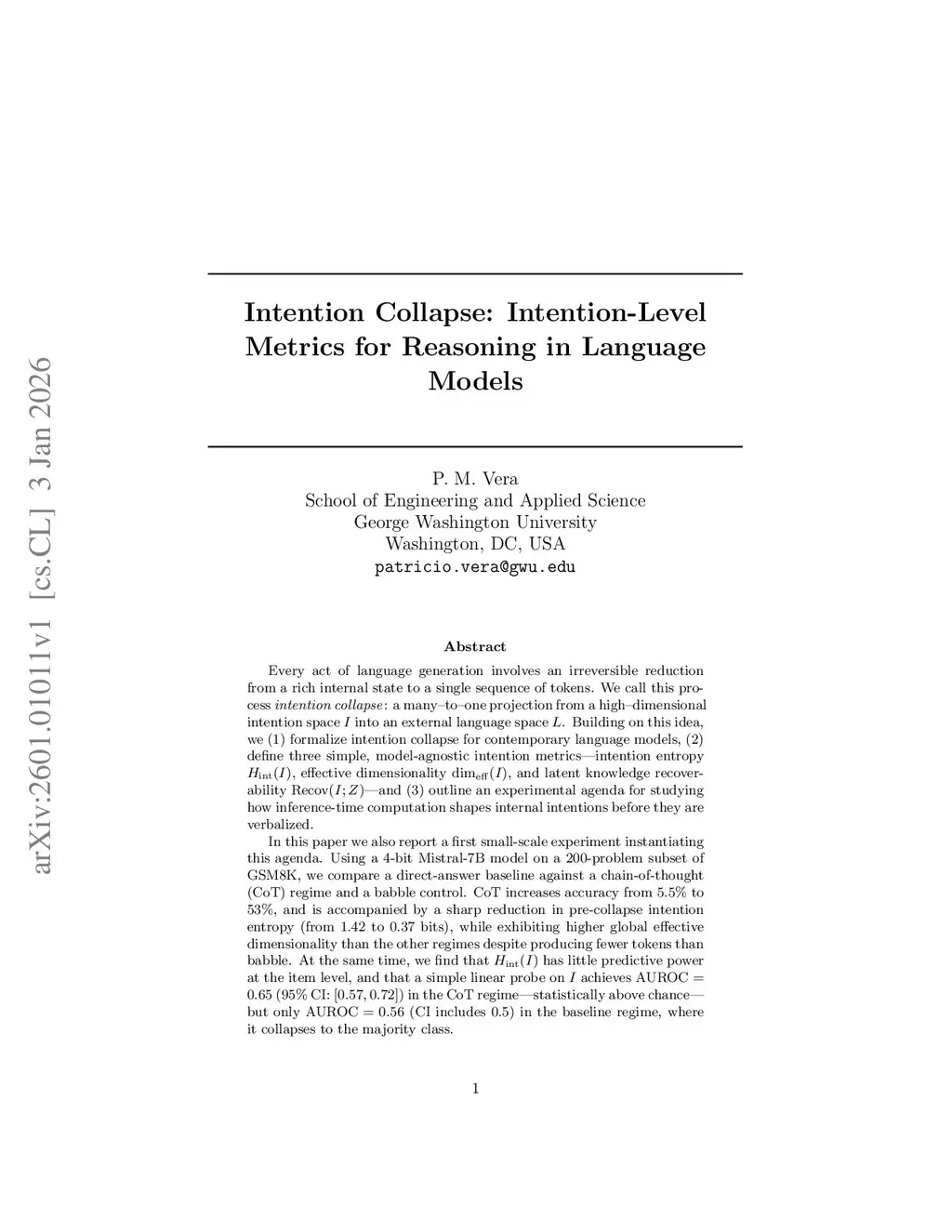 Language generation maps a rich, high-dimensional internal state to a single token sequence. We study this many-to-one mapping through the lens of intention collapse: the projection from an internal intention space I to an external language space L. We introduce three cheap, model-agnostic metrics computed on a pre-collapse state I: (i) intention entropy Hint(I), (ii) effective dimensionality deff(I), and (iii) recoverability Recov(I), operationalized as probe AUROC for predicting eventual success. We evaluate these metrics in a 3x3 study across models (Mistral-7B, LLaMA-3.1-8B, Qwen-2.5-7B) and benchmarks (GSM8K, ARC-Challenge, AQUA-RAT), comparing baseline, chain-of-thought (CoT), and a babble control (n=200 items per cell). CoT increases average accuracy from 34.2% to 47.3% (+13.1 pp), driven by large gains on GSM8K but consistent degradations on ARC-Challenge. Across models, CoT induces distinct entropy regimes relative to baseline, dH = Hint(CoT) - Hint(Base): Mistral shows dH < 0 (lower-entropy CoT), whereas LLaMA shows dH > 0 (higher-entropy CoT), highlighting heterogeneity in CoT-induced internal uncertainty. Finally, probe AUROC is significantly above chance in a subset of settings and can dissociate from behavioral accuracy (e.g., high AUROC alongside lower CoT accuracy on ARC-Challenge for Qwen), suggesting that informative internal signal is not always reliably converted into a final discrete decision under constrained response formats.