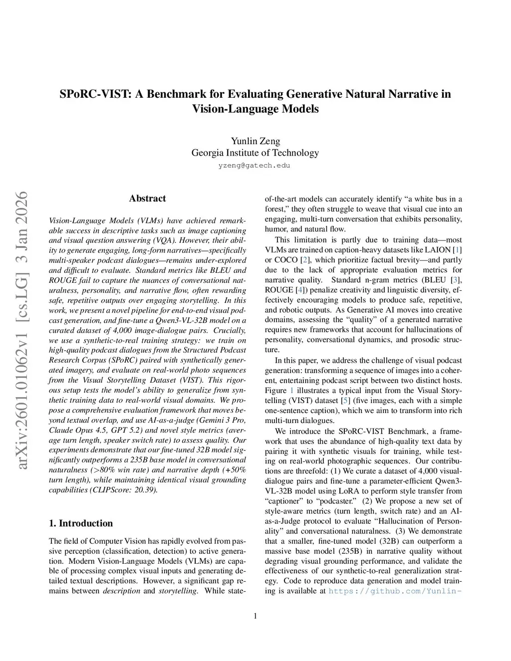 Vision-Language Models (VLMs) have achieved remarkable success in descriptive tasks such as image captioning and visual question answering (VQA). However, their ability to generate engaging, long-form narratives -- specifically multi-speaker podcast dialogues -- remains under-explored and difficult to evaluate. Standard metrics like BLEU and ROUGE fail to capture the nuances of conversational naturalness, personality, and narrative flow, often rewarding safe, repetitive outputs over engaging storytelling. In this work, we present a novel pipeline for end-to-end visual podcast generation, and fine-tune a Qwen3-VL-32B model on a curated dataset of 4,000 image-dialogue pairs. Crucially, we use a synthetic-to-real training strategy: we train on high-quality podcast dialogues from the Structured Podcast Research Corpus (SPoRC) paired with synthetically generated imagery, and evaluate on real-world photo sequences from the Visual Storytelling Dataset (VIST). This rigorous setup tests the model's ability to generalize from synthetic training data to real-world visual domains. We propose a comprehensive evaluation framework that moves beyond textual overlap, and use AI-as-a-judge (Gemini 3 Pro, Claude Opus 4.5, GPT 5.2) and novel style metrics (average turn length, speaker switch rate) to assess quality. Our experiments demonstrate that our fine-tuned 32B model significantly outperforms a 235B base model in conversational naturalness (80\% win rate) and narrative depth (+50\% turn length), while maintaining identical visual grounding capabilities (CLIPScore: 20.39).
