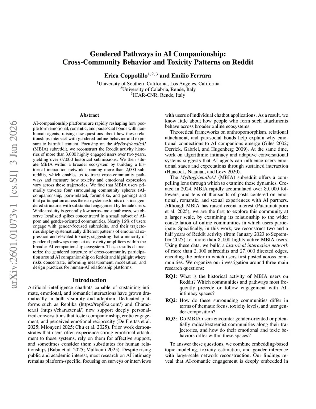 AI-companionship platforms are rapidly reshaping how people form emotional, romantic, and parasocial bonds with non-human agents, raising new questions about how these relationships intersect with gendered online behavior and exposure to harmful content. Focusing on the MyBoyfriendIsAI (MBIA) subreddit, we reconstruct the Reddit activity histories of more than 3,000 highly engaged users over two years, yielding over 67,000 historical submissions. We then situate MBIA within a broader ecosystem by building a historical interaction network spanning more than 2,000 subreddits, which enables us to trace cross-community pathways and measure how toxicity and emotional expression vary across these trajectories. We find that MBIA users primarily traverse four surrounding community spheres (AI-companionship, porn-related, forum-like, and gaming) and that participation across the ecosystem exhibits a distinct gendered structure, with substantial engagement by female users. While toxicity is generally low across most pathways, we observe localized spikes concentrated in a small subset of AI-porn and gender-oriented communities. Nearly 16% of users engage with gender-focused subreddits, and their trajectories display systematically different patterns of emotional expression and elevated toxicity, suggesting that a minority of gendered pathways may act as toxicity amplifiers within the broader AI-companionship ecosystem. These results characterize the gendered structure of cross-community participation around AI companionship on Reddit and highlight where risks concentrate, informing measurement, moderation, and design practices for human-AI relationship platforms.