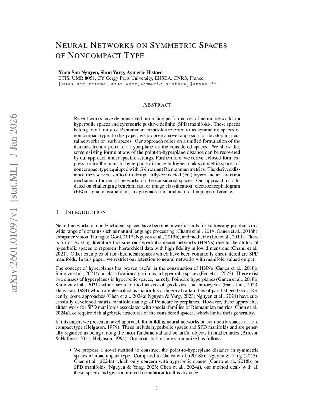 Recent works have demonstrated promising performances of neural networks on hyperbolic spaces and symmetric positive definite (SPD) manifolds. These spaces belong to a family of Riemannian manifolds referred to as symmetric spaces of noncompact type. In this paper, we propose a novel approach for developing neural networks on such spaces. Our approach relies on a unified formulation of the distance from a point to a hyperplane on the considered spaces. We show that some existing formulations of the point-to-hyperplane distance can be recovered by our approach under specific settings. Furthermore, we derive a closed-form expression for the point-to-hyperplane distance in higher-rank symmetric spaces of noncompact type equipped with G-invariant Riemannian metrics. The derived distance then serves as a tool to design fully-connected (FC) layers and an attention mechanism for neural networks on the considered spaces. Our approach is validated on challenging benchmarks for image classification, electroencephalogram (EEG) signal classification, image generation, and natural language inference.