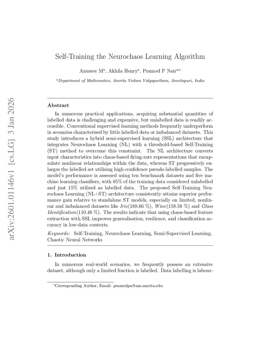 In numerous practical applications, acquiring substantial quantities of labelled data is challenging and expensive, but unlabelled data is readily accessible. Conventional supervised learning methods frequently underperform in scenarios characterised by little labelled data or imbalanced datasets. This study introduces a hybrid semi-supervised learning (SSL) architecture that integrates Neurochaos Learning (NL) with a threshold-based Self-Training (ST) method to overcome this constraint. The NL architecture converts input characteristics into chaos-based ring-rate representations that encapsulate nonlinear relationships within the data, whereas ST progressively enlarges the labelled set utilising high-confidence pseudo-labelled samples. The model's performance is assessed using ten benchmark datasets and five machine learning classifiers, with 85% of the training data considered unlabelled and just 15% utilised as labelled data. The proposed Self-Training Neurochaos Learning (NL+ST) architecture consistently attains superior performance gain relative to standalone ST models, especially on limited, nonlinear and imbalanced datasets like Iris (188.66%), Wine (158.58%) and Glass Identification (110.48%). The results indicate that using chaos-based feature extraction with SSL improves generalisation, resilience, and classification accuracy in low-data contexts.