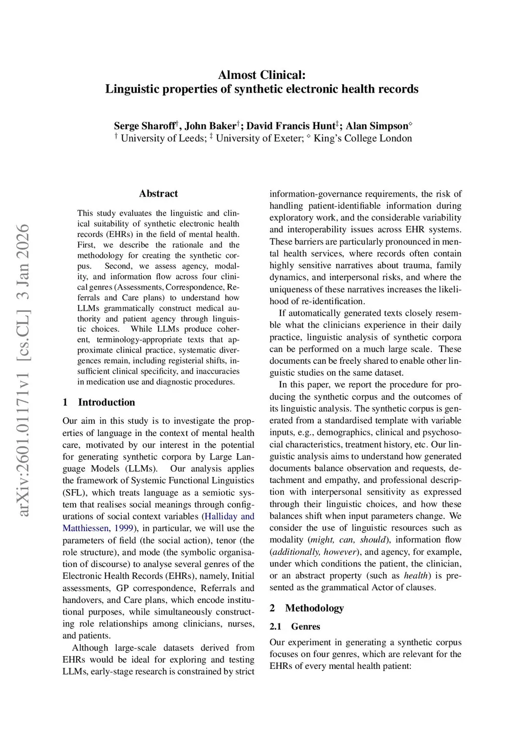 This study evaluates the linguistic and clinical suitability of synthetic electronic health records in mental health. First, we describe the rationale and the methodology for creating the synthetic corpus. Second, we examine expressions of agency, modality, and information flow across four clinical genres (Assessments, Correspondence, Referrals and Care plans) with the aim to understand how LLMs grammatically construct medical authority and patient agency through linguistic choices. While LLMs produce coherent, terminology-appropriate texts that approximate clinical practice, systematic divergences remain, including registerial shifts, insufficient clinical specificity, and inaccuracies in medication use and diagnostic procedures. The results show both the potential and limitations of synthetic corpora for enabling large-scale linguistic research otherwise impossible with genuine patient records.