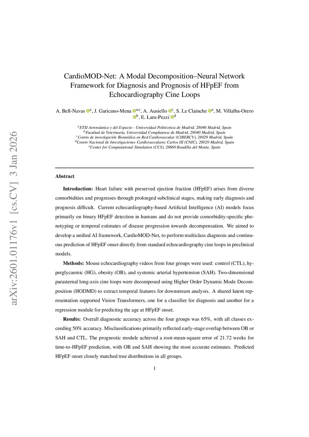 Introduction: Heart failure with preserved ejection fraction (HFpEF) arises from diverse comorbidities and progresses through prolonged subclinical stages, making early diagnosis and prognosis difficult. Current echocardiography-based Artificial Intelligence (AI) models focus primarily on binary HFpEF detection in humans and do not provide comorbidity-specific phenotyping or temporal estimates of disease progression towards decompensation. We aimed to develop a unified AI framework, CardioMOD-Net, to perform multiclass diagnosis and continuous prediction of HFpEF onset directly from standard echocardiography cine loops in preclinical models.Methods: Mouse echocardiography videos from four groups were used: control (CTL), hyperglycaemic (HG), obesity (OB), and systemic arterial hypertension (SAH). Two-dimensional parasternal long-axis cine loops were decomposed using Higher Order Dynamic Mode Decomposition (HODMD) to extract temporal features for downstream analysis. A shared latent representation supported Vision Transformers, one for a classifier for diagnosis and another for a regression module for predicting the age at HFpEF onset.Results: Overall diagnostic accuracy across the four groups was 65%, with all classes exceeding 50% accuracy. Misclassifications primarily reflected early-stage overlap between OB or SAH and CTL. The prognostic module achieved a root-mean-square error of 21.72 weeks for time-to-HFpEF prediction, with OB and SAH showing the most accurate estimates. Predicted HFpEF onset closely matched true distributions in all groups.Discussion: This unified framework demonstrates that multiclass phenotyping and continuous HFpEF onset prediction can be obtained from a single cine loop, even under small-data conditions. The approach offers a foundation for integrating diagnostic and prognostic modelling in preclinical HFpEF research.