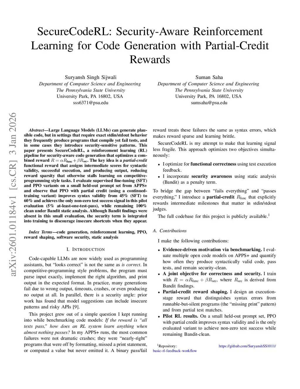 Large Language Models (LLMs) can generate plausible code, but in settings that require exact stdin/stdout behavior they frequently produce programs that compile yet fail tests, and in some cases they introduce security-sensitive patterns. This paper presents SecureCodeRL, a reinforcement learning (RL) pipeline for security-aware code generation that optimizes a combined reward R = {\alpha}Rfunc + \b{eta}Rsec. The key idea is a partial-credit functional reward that assigns intermediate scores for syntactic validity, successful execution, and producing output, reducing reward sparsity that otherwise stalls learning on competitive programming style tasks. I evaluate supervised fine-tuning (SFT) and PPO variants on a small held-out prompt set from APPS+ and observe that PPO with partial credit (using a continued-training variant) improves syntax validity from 45% (SFT) to 60% and achieves the only non-zero test success signal in this pilot evaluation (5% at-least-one-test-pass), while remaining 100% clean under Bandit static analysis. Although Bandit findings were absent in this small evaluation, the security term is integrated into training to discourage insecure shortcuts when they appear.