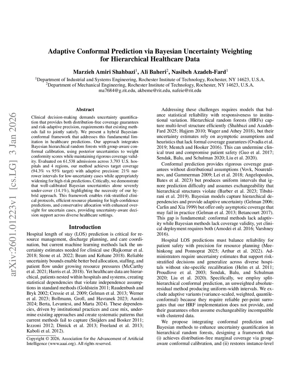 Clinical decision-making demands uncertainty quantification that provides both distribution-free coverage guarantees and risk-adaptive precision, requirements that existing methods fail to jointly satisfy. We present a hybrid Bayesian-conformal framework that addresses this fundamental limitation in healthcare predictions. Our approach integrates Bayesian hierarchical random forests with group-aware conformal calibration, using posterior uncertainties to weight conformity scores while maintaining rigorous coverage validity. Evaluated on 61,538 admissions across 3,793 U.S. hospitals and 4 regions, our method achieves target coverage (94.3% vs 95% target) with adaptive precision: 21% narrower intervals for low-uncertainty cases while appropriately widening for high-risk predictions. Critically, we demonstrate that well-calibrated Bayesian uncertainties alone severely under-cover (14.1%), highlighting the necessity of our hybrid approach. This framework enables risk-stratified clinical protocols, efficient resource planning for high-confidence predictions, and conservative allocation with enhanced oversight for uncertain cases, providing uncertainty-aware decision support across diverse healthcare settings.