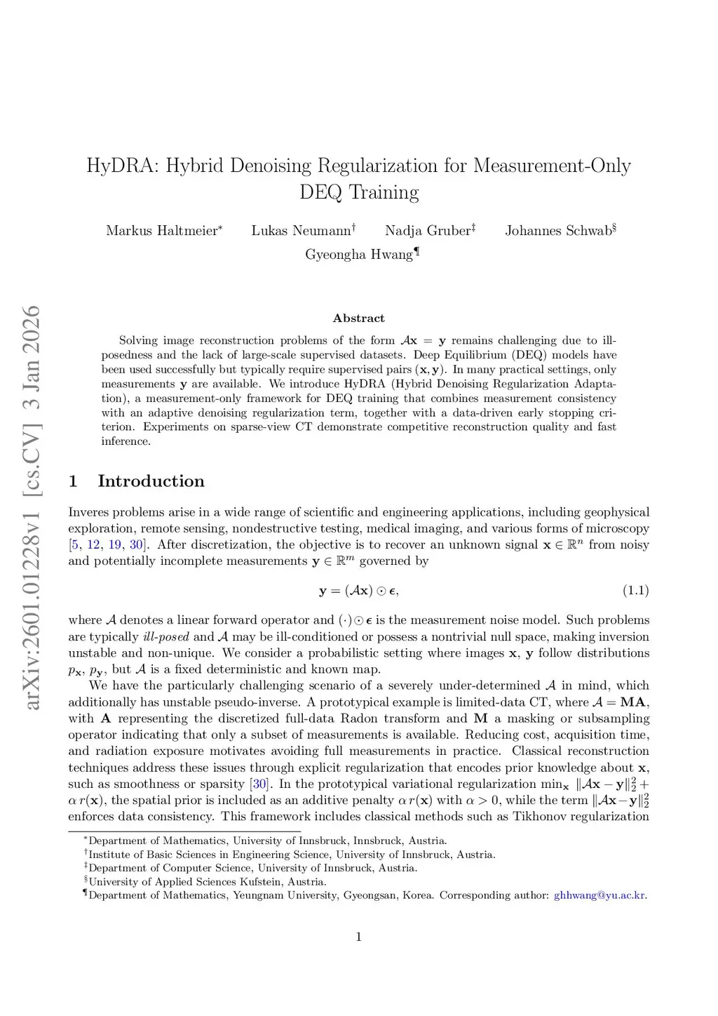 Solving image reconstruction problems of the form \(\mathbf{A} \mathbf{x} = \mathbf{y}\) remains challenging due to ill-posedness and the lack of large-scale supervised datasets. Deep Equilibrium (DEQ) models have been used successfully but typically require supervised pairs \((\mathbf{x},\mathbf{y})\). In many practical settings, only measurements \(\mathbf{y}\) are available. We introduce HyDRA (Hybrid Denoising Regularization Adaptation), a measurement-only framework for DEQ training that combines measurement consistency with an adaptive denoising regularization term, together with a data-driven early stopping criterion. Experiments on sparse-view CT demonstrate competitive reconstruction quality and fast inference.