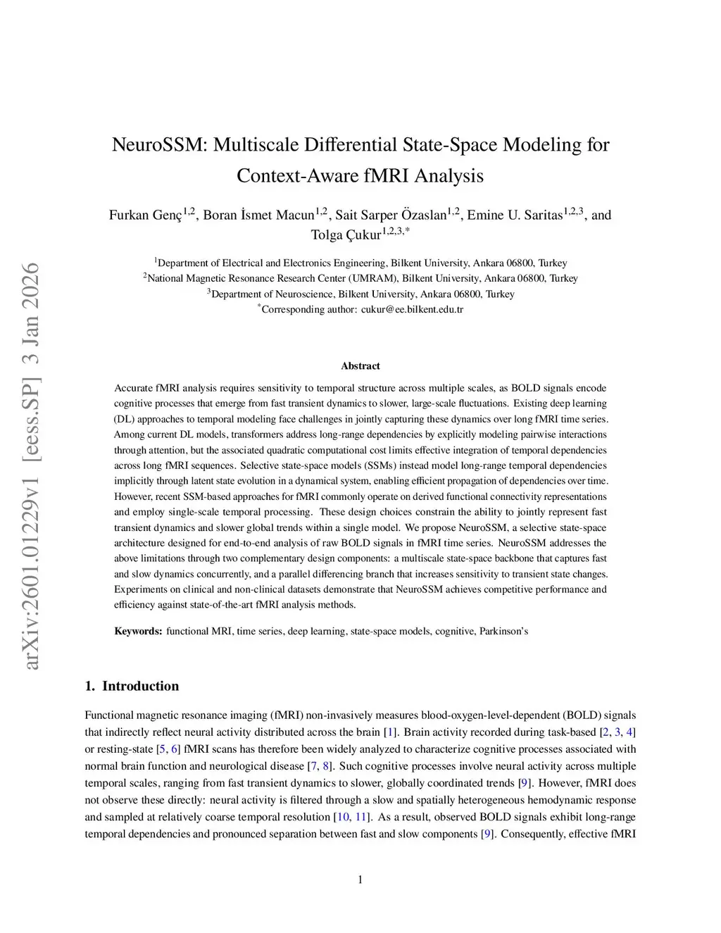 Accurate fMRI analysis requires sensitivity to temporal structure across multiple scales, as BOLD signals encode cognitive processes that emerge from fast transient dynamics to slower, large-scale fluctuations. Existing deep learning (DL) approaches to temporal modeling face challenges in jointly capturing these dynamics over long fMRI time series. Among current DL models, transformers address long-range dependencies by explicitly modeling pairwise interactions through attention, but the associated quadratic computational cost limits effective integration of temporal dependencies across long fMRI sequences. Selective state-space models (SSMs) instead model long-range temporal dependencies implicitly through latent state evolution in a dynamical system, enabling efficient propagation of dependencies over time. However, recent SSM-based approaches for fMRI commonly operate on derived functional connectivity representations and employ single-scale temporal processing. These design choices constrain the ability to jointly represent fast transient dynamics and slower global trends within a single model. We propose NeuroSSM, a selective state-space architecture designed for end-to-end analysis of raw BOLD signals in fMRI time series. NeuroSSM addresses the above limitations through two complementary design components: a multiscale state-space backbone that captures fast and slow dynamics concurrently, and a parallel differencing branch that increases sensitivity to transient state changes. Experiments on clinical and non-clinical datasets demonstrate that NeuroSSM achieves competitive performance and efficiency against state-of-the-art fMRI analysis methods.