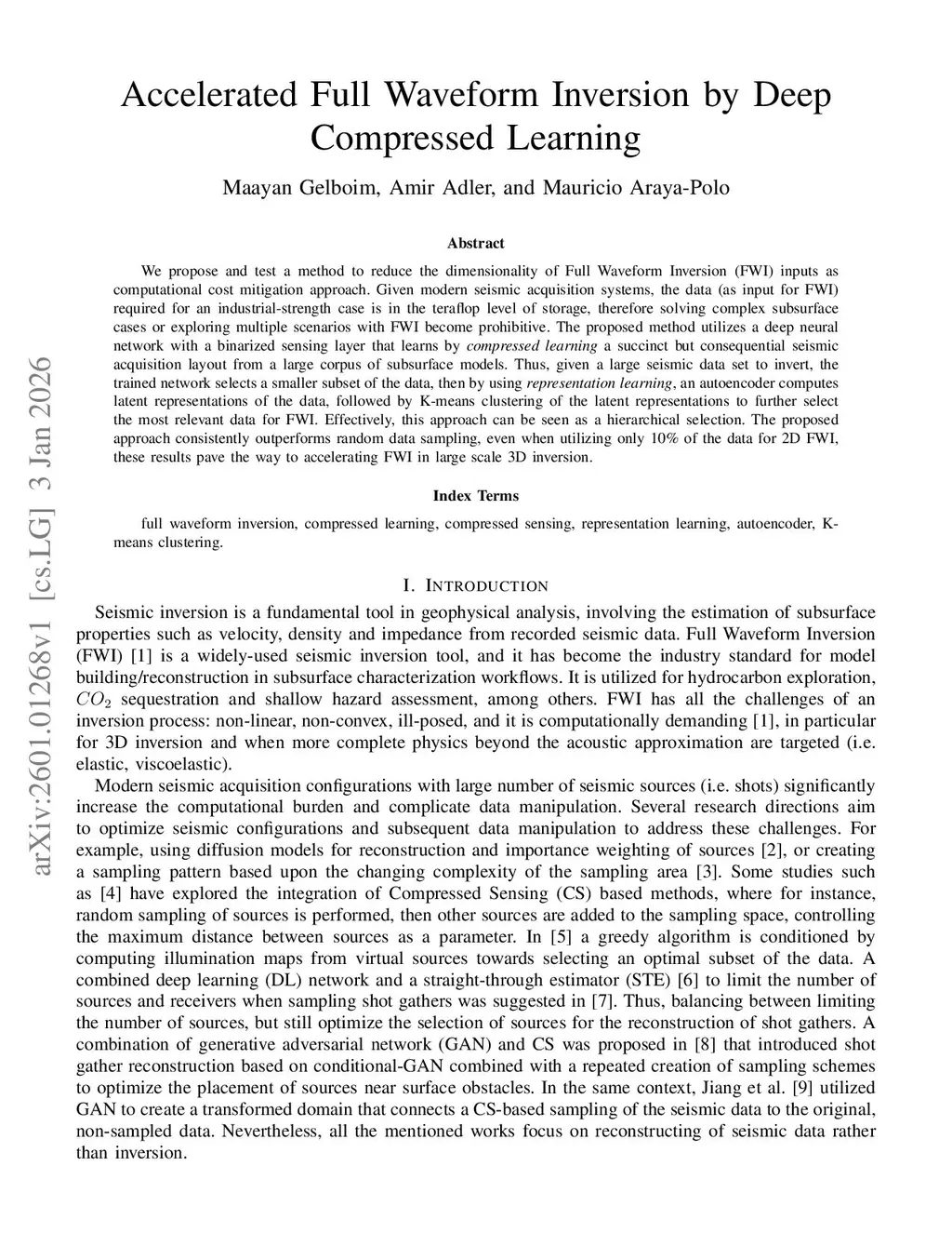 We propose and test a method to reduce the dimensionality of Full Waveform Inversion (FWI) inputs as computational cost mitigation approach. Given modern seismic acquisition systems, the data (as input for FWI) required for an industrial-strength case is in the teraflop level of storage, therefore solving complex subsurface cases or exploring multiple scenarios with FWI become prohibitive. The proposed method utilizes a deep neural network with a binarized sensing layer that learns by compressed learning a succinct but consequential seismic acquisition layout from a large corpus of subsurface models. Thus, given a large seismic data set to invert, the trained network selects a smaller subset of the data, then by using representation learning, an autoencoder computes latent representations of the data, followed by K-means clustering of the latent representations to further select the most relevant data for FWI. Effectively, this approach can be seen as a hierarchical selection. The proposed approach consistently outperforms random data sampling, even when utilizing only 10% of the data for 2D FWI, these results pave the way to accelerating FWI in large scale 3D inversion.