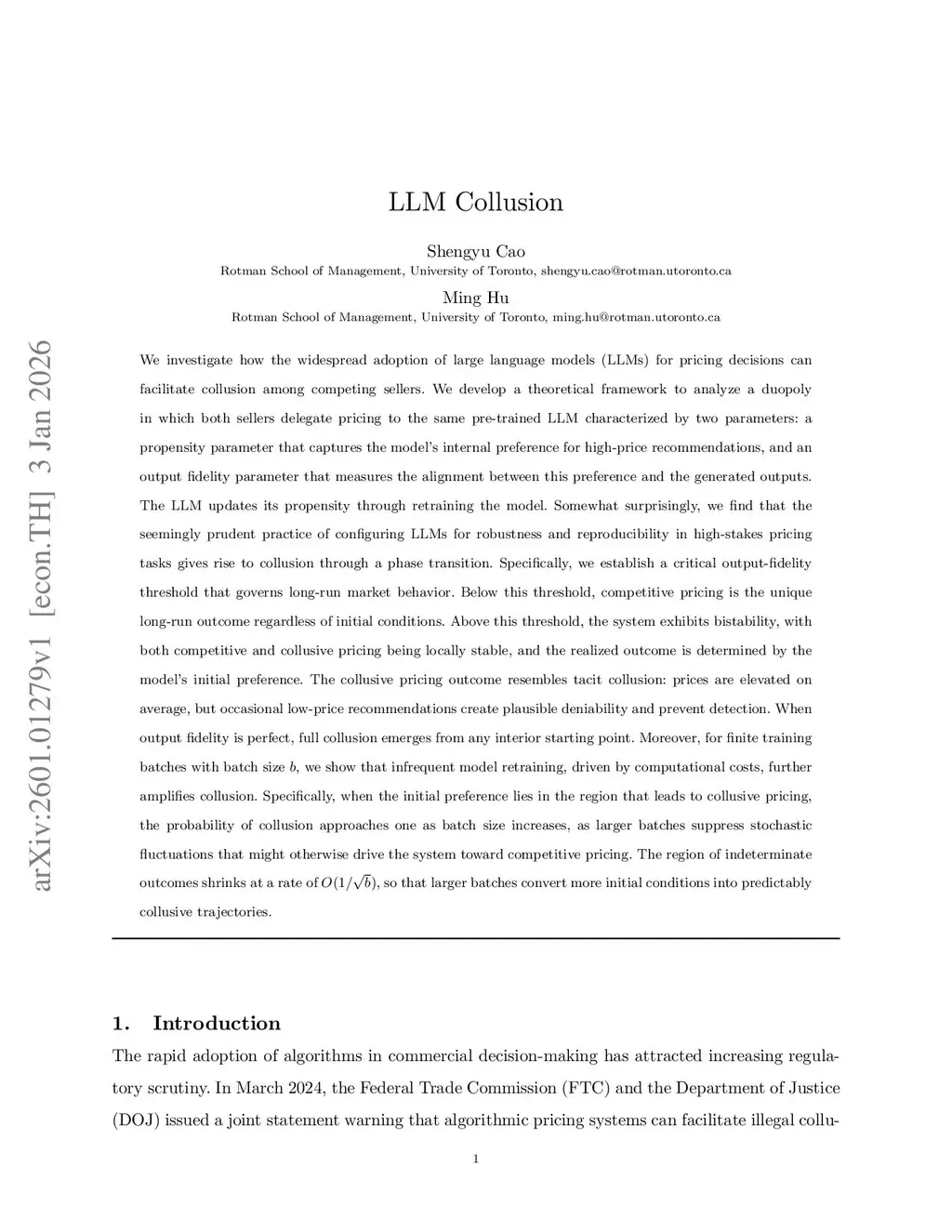 We study how delegating pricing to large language models (LLMs) can facilitate collusion in a duopoly when both sellers rely on the same pre-trained model. The LLM is characterized by (i) a propensity parameter capturing its internal bias toward high-price recommendations and (ii) an output-fidelity parameter measuring how tightly outputs track that bias; the propensity evolves through retraining. We show that configuring LLMs for robustness and reproducibility can induce collusion via a phase transition: there exists a critical output-fidelity threshold that pins down long-run behavior. Below it, competitive pricing is the unique long-run outcome. Above it, the system is bistable, with competitive and collusive pricing both locally stable and the realized outcome determined by the model's initial preference. The collusive regime resembles tacit collusion: prices are elevated on average, yet occasional low-price recommendations provide plausible deniability. With perfect fidelity, full collusion emerges from any interior initial condition. For finite training batches of size , infrequent retraining (driven by computational costs) further amplifies collusion: conditional on starting in the collusive basin, the probability of collusion approaches one as grows, since larger batches dampen stochastic fluctuations that might otherwise tip the system toward competition. The indeterminacy region shrinks at rate .