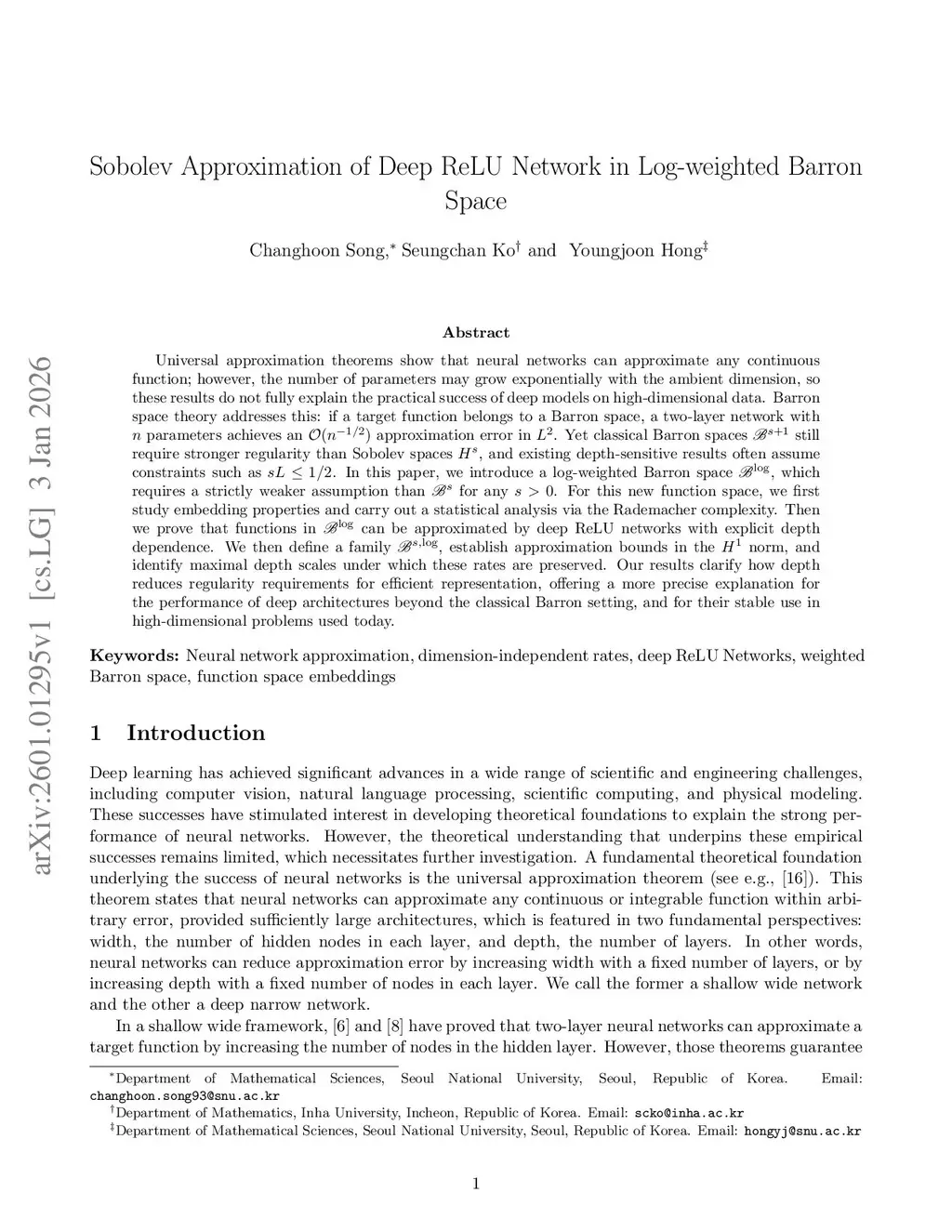 Universal approximation theorems show that neural networks can approximate any continuous function; however, the number of parameters may grow exponentially with the ambient dimension, so these results do not fully explain the practical success of deep models on high-dimensional data. Barron space theory addresses this: if a target function belongs to a Barron space, a two-layer network with parameters achieves an approximation error in . Yet classical Barron spaces still require stronger regularity than Sobolev spaces , and existing depth-sensitive results often assume constraints such as . In this paper, we introduce a log-weighted Barron space , which requires a strictly weaker assumption than for any . For this new function space, we first study embedding properties and carry out a statistical analysis via the Rademacher complexity. Then we prove that functions in can be approximated by deep ReLU networks with explicit depth dependence. We then define a family , establish approximation bounds in the norm, and identify maximal depth scales under which these rates are preserved. Our results clarify how depth reduces regularity requirements for efficient representation, offering a more precise explanation for the performance of deep architectures beyond the classical Barron setting, and for their stable use in high-dimensional problems used today.