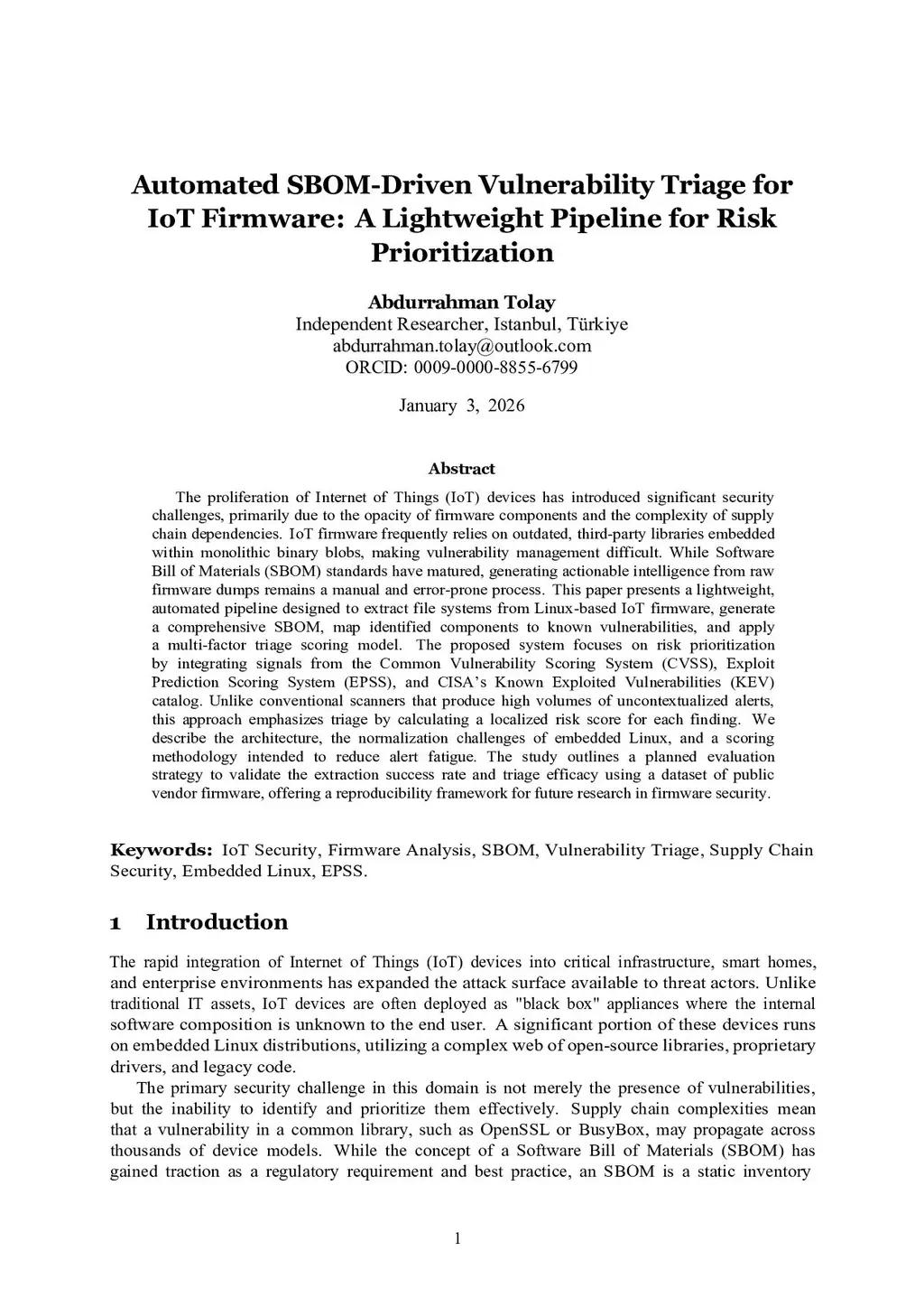 The proliferation of Internet of Things (IoT) devices has introduced significant security challenges, primarily due to the opacity of firmware components and the complexity of supply chain dependencies. IoT firmware frequently relies on outdated, third-party libraries embedded within monolithic binary blobs, making vulnerability management difficult. While Software Bill of Materials (SBOM) standards have matured, generating actionable intelligence from raw firmware dumps remains a manual and error-prone process. This paper presents a lightweight, automated pipeline designed to extract file systems from Linux-based IoT firmware, generate a comprehensive SBOM, map identified components to known vulnerabilities, and apply a multi-factor triage scoring model. The proposed system focuses on risk prioritization by integrating signals from the Common Vulnerability Scoring System (CVSS), Exploit Prediction Scoring System (EPSS), and the CISA Known Exploited Vulnerabilities (KEV) catalog. Unlike conventional scanners that produce high volumes of uncontextualized alerts, this approach emphasizes triage by calculating a localized risk score for each finding. We describe the architecture, the normalization challenges of embedded Linux, and a scoring methodology intended to reduce alert fatigue. The study outlines a planned evaluation strategy to validate the extraction success rate and triage efficacy using a dataset of public vendor firmware, offering a reproducibility framework for future research in firmware security.