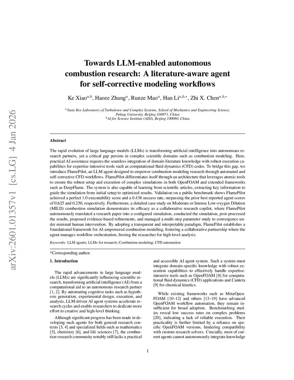 The rapid evolution of large language models (LLMs) is transforming artificial intelligence into autonomous research partners, yet a critical gap persists in complex scientific domains such as combustion modeling. Here, practical AI assistance requires the seamless integration of domain literature knowledge with robust execution capabilities for expertise-intensive tools such as computational fluid dynamics (CFD) codes. To bridge this gap, we introduce FlamePilot, an LLM agent designed to empower combustion modeling research through automated and self-corrective CFD workflows. FlamePilot differentiates itself through an architecture that leverages atomic tools to ensure the robust setup and execution of complex simulations in both OpenFOAM and extended frameworks such as DeepFlame. The system is also capable of learning from scientific articles, extracting key information to guide the simulation from initial setup to optimized results. Validation on a public benchmark shows FlamePilot achieved a perfect 1.0 executability score and a 0.438 success rate, surpassing the prior best reported agent scores of 0.625 and 0.250, respectively. Furthermore, a detailed case study on Moderate or Intense Low-oxygen Dilution (MILD) combustion simulation demonstrates its efficacy as a collaborative research copilot, where FlamePilot autonomously translated a research paper into a configured simulation, conducted the simulation, post-processed the results, proposed evidence-based refinements, and managed a multi-step parameter study to convergence under minimal human intervention. By adopting a transparent and interpretable paradigm, FlamePilot establishes a foundational framework for AI-empowered combustion modeling, fostering a collaborative partnership where the agent manages workflow orchestration, freeing the researcher for high-level analysis.