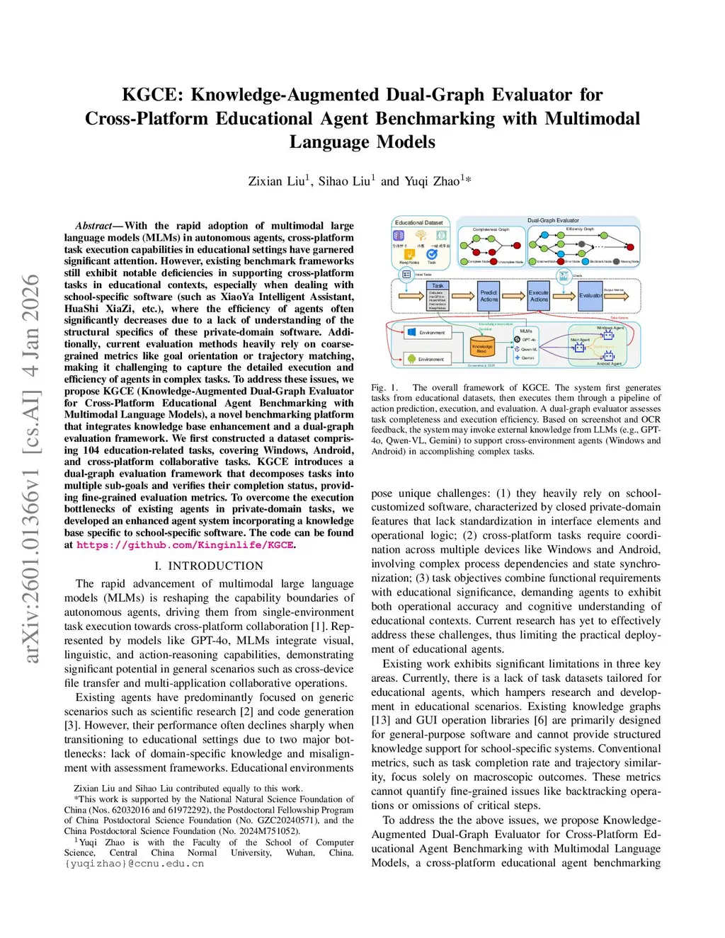 KGCE: Knowledge-Augmented Dual-Graph Evaluator for Cross-Platform Educational Agent Benchmarking with Multimodal Language Models
