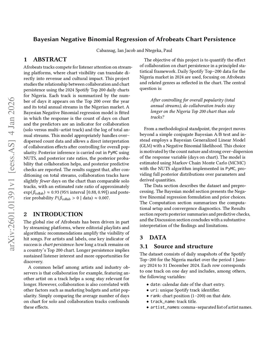Bayesian Negative Binomial Regression of Afrobeats Chart Persistence