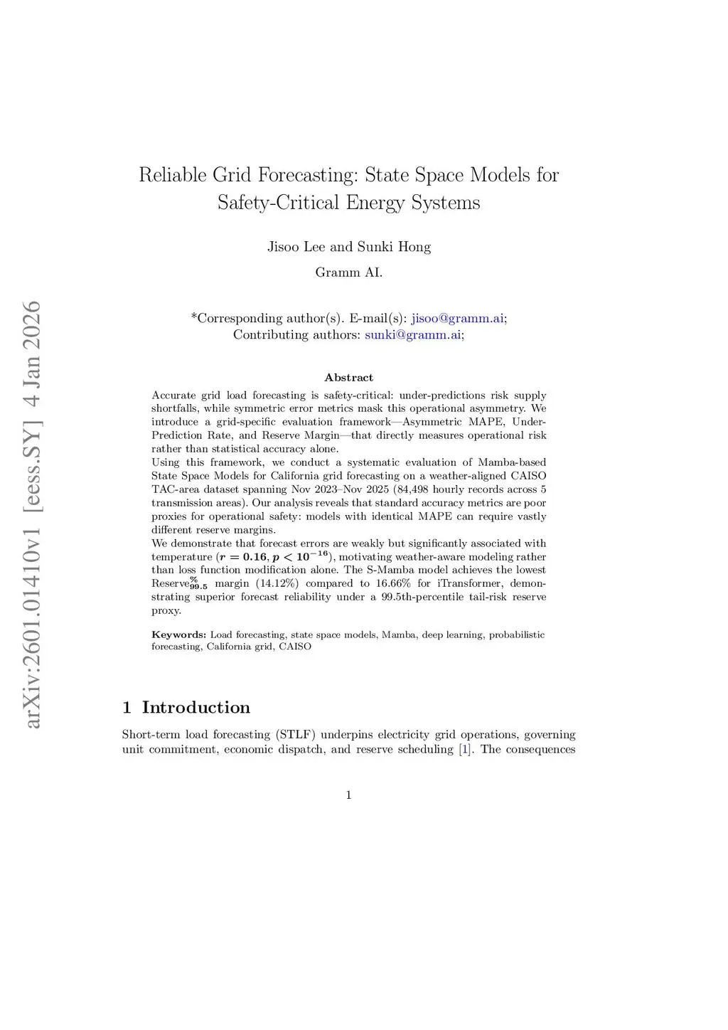 Accurate grid load forecasting is safety-critical: under-predictions risk supply shortfalls, while symmetric error metrics can mask this operational asymmetry. We introduce an operator-legible evaluation framework -- Under-Prediction Rate (UPR), tail Reserve requirements, and explicit inflation diagnostics (Bias/OPR) -- to quantify one-sided reliability risk beyond MAPE.Using this framework, we evaluate state space models (Mamba variants) and strong baselines on a weather-aligned California Independent System Operator (CAISO) dataset spanning Nov 2023--Nov 2025 (84,498 hourly records across 5 regional transmission areas) under a rolling-origin walk-forward backtest. We develop and evaluate thermal-lag-aligned weather fusion strategies for these architectures.Our results demonstrate that standard accuracy metrics are insufficient proxies for operational safety: models with comparable MAPE can imply materially different tail reserve requirements (Reserve). We show that explicit weather integration narrows error distributions, reducing the impact of temperature-driven demand spikes. Furthermore, while probabilistic calibration reduces large-error events, it can induce systematic schedule inflation. We introduce Bias/OPR-constrained objectives to enable auditable trade-offs between minimizing tail risk and preventing trivial over-forecasting.