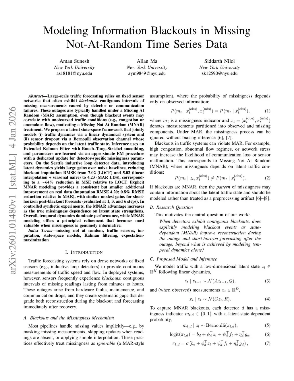 Large-scale traffic forecasting relies on fixed sensor networks that often exhibit blackouts: contiguous intervals of missing measurements caused by detector or communication failures. These outages are typically handled under a Missing At Random (MAR) assumption, even though blackout events may correlate with unobserved traffic conditions (e.g., congestion or anomalous flow), motivating a Missing Not At Random (MNAR) treatment. We propose a latent state-space framework that jointly models (i) traffic dynamics via a linear dynamical system and (ii) sensor dropout via a Bernoulli observation channel whose probability depends on the latent traffic state. Inference uses an Extended Kalman Filter with Rauch-Tung-Striebel smoothing, and parameters are learned via an approximate EM procedure with a dedicated update for detector-specific missingness parameters. On the Seattle inductive loop detector data, introducing latent dynamics yields large gains over naive baselines, reducing blackout imputation RMSE from 7.02 (LOCF) and 5.02 (linear interpolation + seasonal naive) to 4.23 (MAR LDS), corresponding to about a 64% reduction in MSE relative to LOCF. Explicit MNAR modeling provides a consistent but smaller additional improvement on real data (imputation RMSE 4.20; 0.8% RMSE reduction relative to MAR), with similar modest gains for short-horizon post-blackout forecasts (evaluated at 1, 3, and 6 steps). In controlled synthetic experiments, the MNAR advantage increases as the true missingness dependence on latent state strengthens. Overall, temporal dynamics dominate performance, while MNAR modeling offers a principled refinement that becomes most valuable when missingness is genuinely informative.
