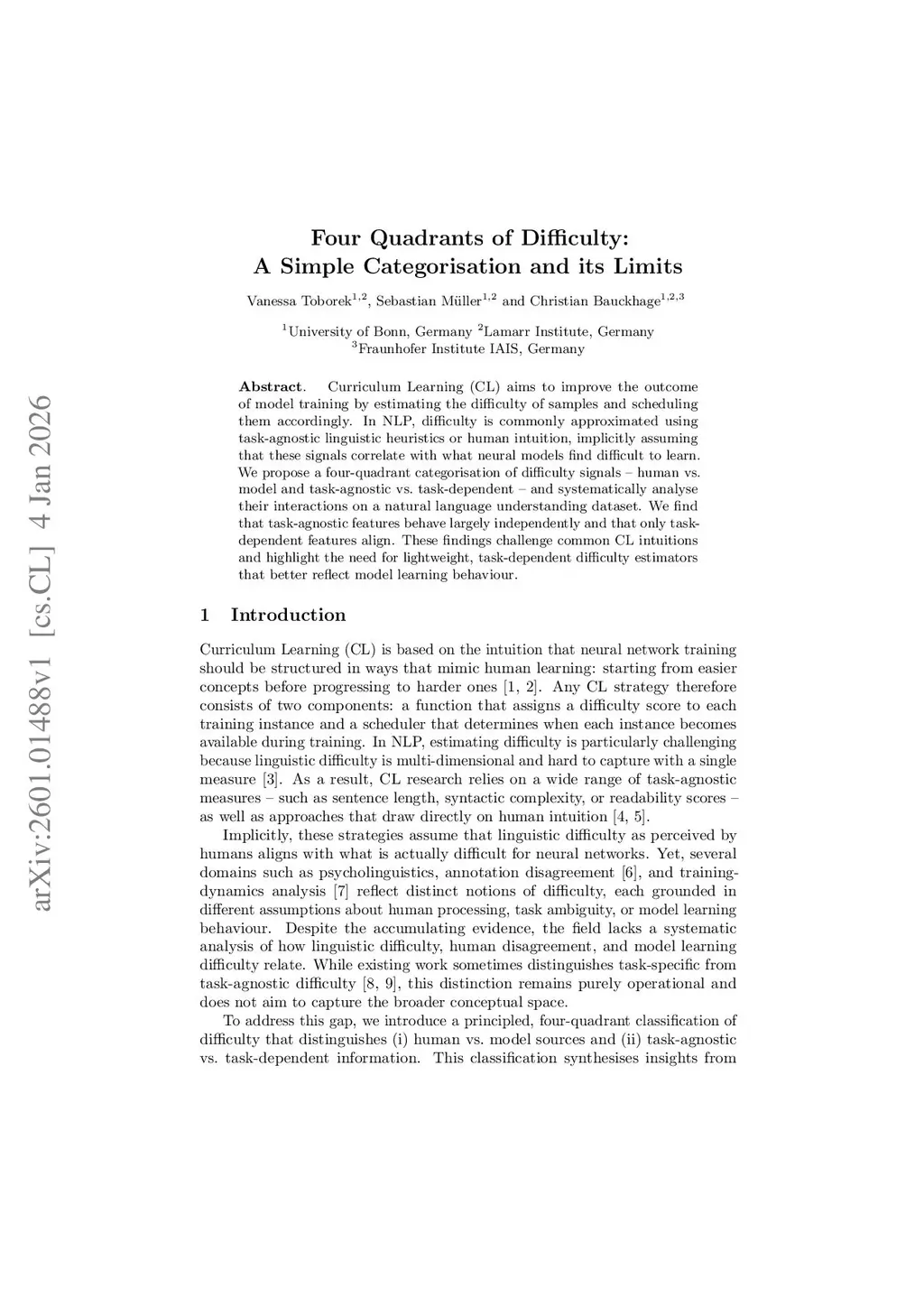 Curriculum Learning (CL) aims to improve the outcome of model training by estimating the difficulty of samples and scheduling them accordingly. In NLP, difficulty is commonly approximated using task-agnostic linguistic heuristics or human intuition, implicitly assuming that these signals correlate with what neural models find difficult to learn. We propose a four-quadrant categorisation of difficulty signals -- human vs. model and task-agnostic vs. task-dependent -- and systematically analyse their interactions on a natural language understanding dataset. We find that task-agnostic features behave largely independently and that only task-dependent features align. These findings challenge common CL intuitions and highlight the need for lightweight, task-dependent difficulty estimators that better reflect model learning behaviour.