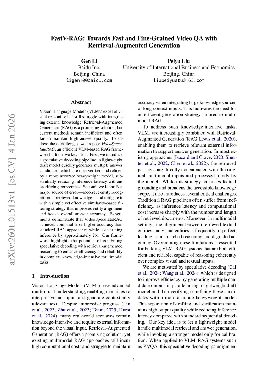 Vision-Language Models (VLMs) excel at visual reasoning but still struggle with integrating external knowledge. Retrieval-Augmented Generation (RAG) is a promising solution, but current methods remain inefficient and often fail to maintain high answer quality. To address these challenges, we propose VideoSpeculateRAG, an efficient VLM-based RAG framework built on two key ideas. First, we introduce a speculative decoding pipeline: a lightweight draft model quickly generates multiple answer candidates, which are then verified and refined by a more accurate heavyweight model, substantially reducing inference latency without sacrificing correctness. Second, we identify a major source of error - incorrect entity recognition in retrieved knowledge - and mitigate it with a simple yet effective similarity-based filtering strategy that improves entity alignment and boosts overall answer accuracy. Experiments demonstrate that VideoSpeculateRAG achieves comparable or higher accuracy than standard RAG approaches while accelerating inference by approximately 2x. Our framework highlights the potential of combining speculative decoding with retrieval-augmented reasoning to enhance efficiency and reliability in complex, knowledge-intensive multimodal tasks.