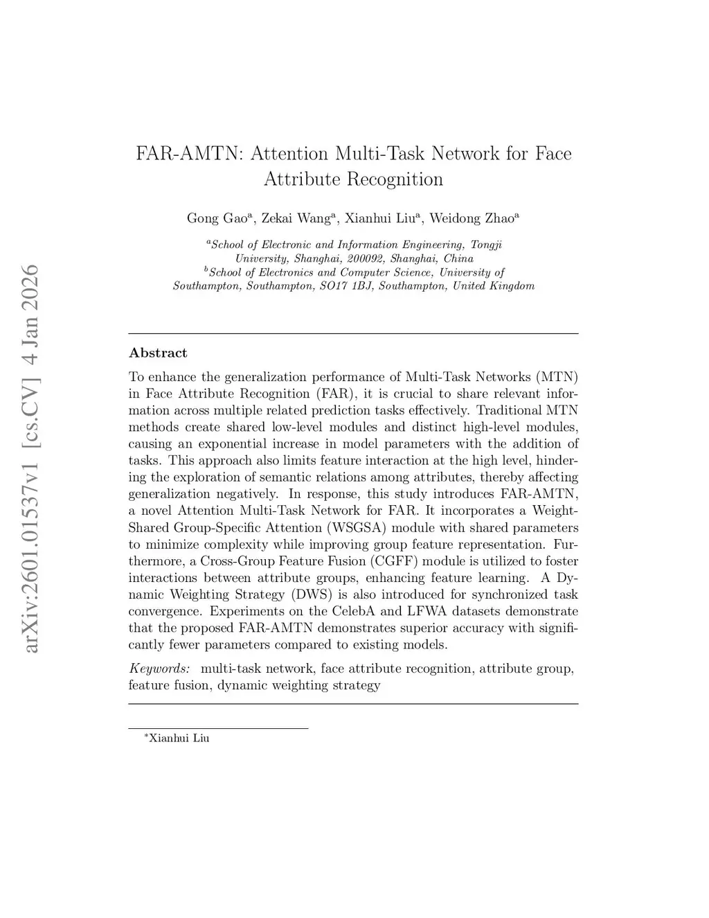 To enhance the generalization performance of Multi-Task Networks (MTN) in Face Attribute Recognition (FAR), it is crucial to share relevant information across multiple related prediction tasks effectively. Traditional MTN methods create shared low-level modules and distinct high-level modules, causing an exponential increase in model parameters with the addition of tasks. This approach also limits feature interaction at the high level, hindering the exploration of semantic relations among attributes, thereby affecting generalization negatively. In response, this study introduces FAR-AMTN, a novel Attention Multi-Task Network for FAR. It incorporates a Weight-Shared Group-Specific Attention (WSGSA) module with shared parameters to minimize complexity while improving group feature representation. Furthermore, a Cross-Group Feature Fusion (CGFF) module is utilized to foster interactions between attribute groups, enhancing feature learning. A Dynamic Weighting Strategy (DWS) is also introduced for synchronized task convergence. Experiments on the CelebA and LFWA datasets demonstrate that the proposed FAR-AMTN demonstrates superior accuracy with significantly fewer parameters compared to existing models.
