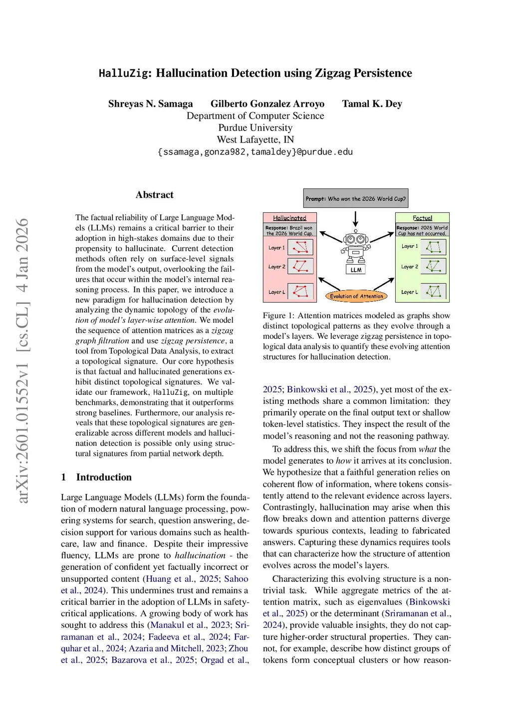 The factual reliability of Large Language Models (LLMs) remains a critical barrier to their adoption in high-stakes domains due to their propensity to hallucinate. Current detection methods often rely on surface-level signals from the model's output, overlooking the failures that occur within the model's internal reasoning process. In this paper, we introduce a new paradigm for hallucination detection by analyzing the dynamic topology of the evolution of model's layer-wise attention. We model the sequence of attention matrices as a zigzag graph filtration and use zigzag persistence, a tool from Topological Data Analysis, to extract a topological signature. Our core hypothesis is that factual and hallucinated generations exhibit distinct topological signatures. We validate our framework, HalluZig, on multiple benchmarks, demonstrating that it outperforms strong baselines. Furthermore, our analysis reveals that these topological signatures are generalizable across different models and hallucination detection is possible only using structural signatures from partial network depth.