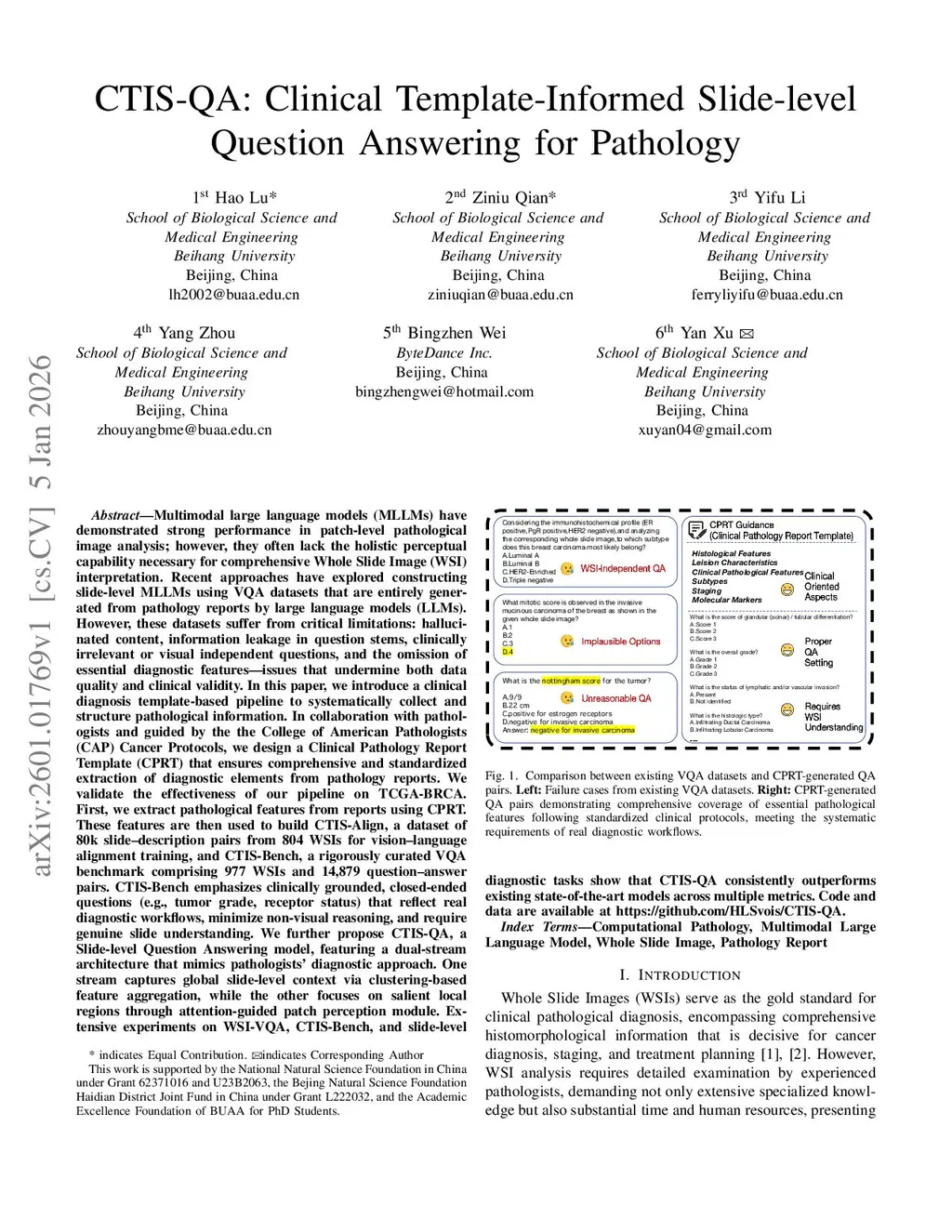 In this paper, we introduce a clinical diagnosis template-based pipeline to systematically collect and structure pathological information. In collaboration with pathologists and guided by the the College of American Pathologists (CAP) Cancer Protocols, we design a Clinical Pathology Report Template (CPRT) that ensures comprehensive and standardized extraction of diagnostic elements from pathology reports. We validate the effectiveness of our pipeline on TCGA-BRCA. First, we extract pathological features from reports using CPRT. These features are then used to build CTIS-Align, a dataset of 80k slide-description pairs from 804 WSIs for vision-language alignment training, and CTIS-Bench, a rigorously curated VQA benchmark comprising 977 WSIs and 14,879 question-answer pairs. CTIS-Bench emphasizes clinically grounded, closed-ended questions (e.g., tumor grade, receptor status) that reflect real diagnostic workflows, minimize non-visual reasoning, and require genuine slide understanding. We further propose CTIS-QA, a Slide-level Question Answering model, featuring a dual-stream architecture that mimics pathologists' diagnostic approach. One stream captures global slide-level context via clustering-based feature aggregation, while the other focuses on salient local regions through attention-guided patch perception module. Extensive experiments on WSI-VQA, CTIS-Bench, and slide-level diagnostic tasks show that CTIS-QA consistently outperforms existing state-of-the-art models across multiple metrics. Code and data are available atthis https URL.