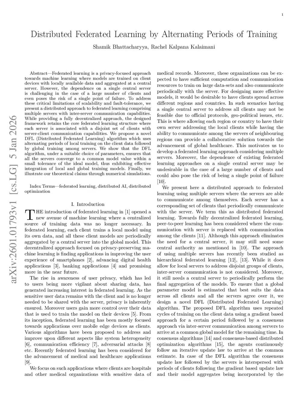Federated learning is a privacy-focused approach towards machine learning where models are trained on client devices with locally available data and aggregated at a central server. However, the dependence on a single central server is challenging in the case of a large number of clients and even poses the risk of a single point of failure. To address these critical limitations of scalability and fault-tolerance, we present a distributed approach to federated learning comprising multiple servers with inter-server communication capabilities. While providing a fully decentralized approach, the designed framework retains the core federated learning structure where each server is associated with a disjoint set of clients with server-client communication capabilities. We propose a novel DFL (Distributed Federated Learning) algorithm which uses alternating periods of local training on the client data followed by global training among servers. We show that the DFL algorithm, under a suitable choice of parameters, ensures that all the servers converge to a common model value within a small tolerance of the ideal model, thus exhibiting effective integration of local and global training models. Finally, we illustrate our theoretical claims through numerical simulations.