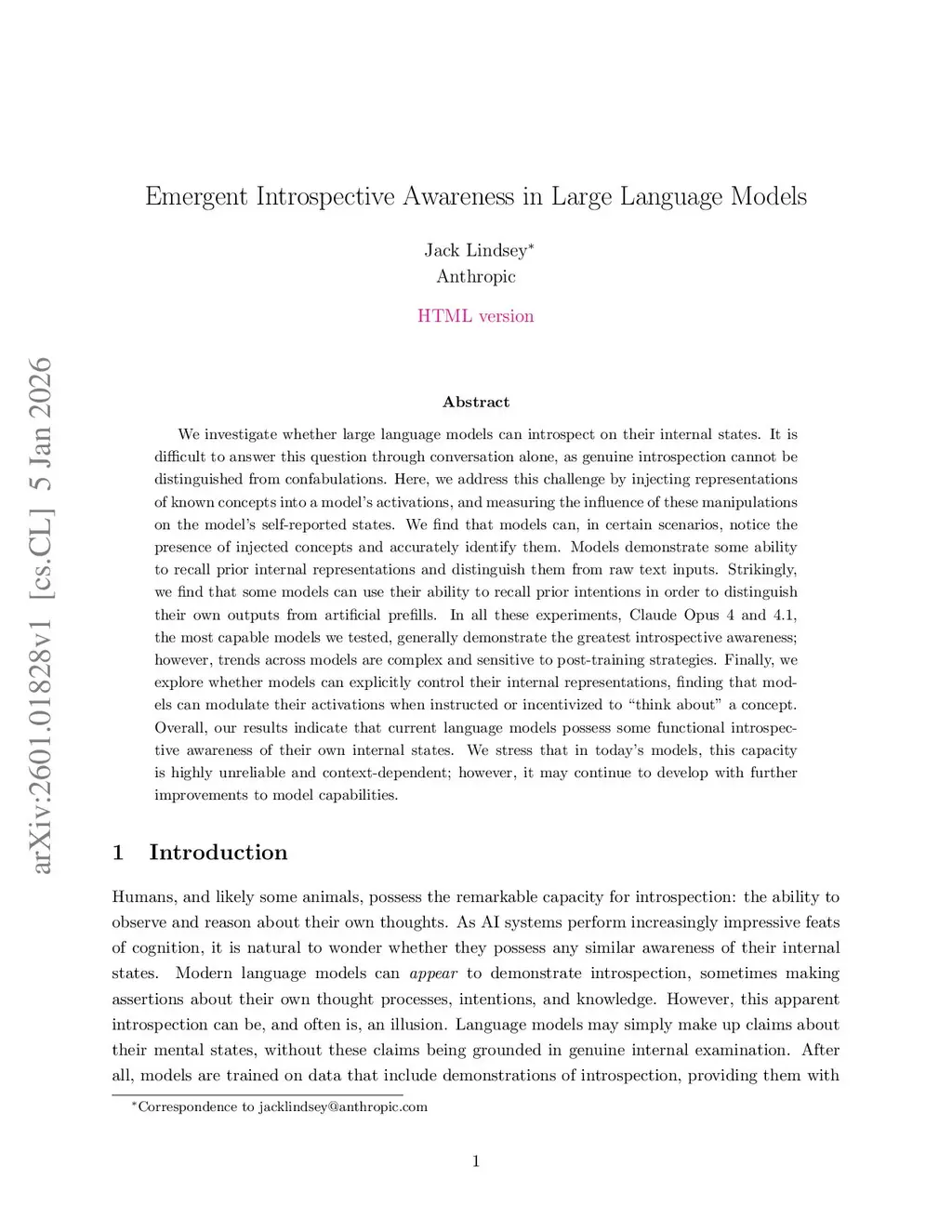 We investigate whether large language models can introspect on their internal states. It is difficult to answer this question through conversation alone, as genuine introspection cannot be distinguished from confabulations. Here, we address this challenge by injecting representations of known concepts into a model's activations, and measuring the influence of these manipulations on the model's self-reported states. We find that models can, in certain scenarios, notice the presence of injected concepts and accurately identify them. Models demonstrate some ability to recall prior internal representations and distinguish them from raw text inputs. Strikingly, we find that some models can use their ability to recall prior intentions in order to distinguish their own outputs from artificial prefills. In all these experiments, Claude Opus 4 and 4.1, the most capable models we tested, generally demonstrate the greatest introspective awareness; however, trends across models are complex and sensitive to post-training strategies. Finally, we explore whether models can explicitly control their internal representations, finding that models can modulate their activations when instructed or incentivized to "think about" a concept. Overall, our results indicate that current language models possess some functional introspective awareness of their own internal states. We stress that in today's models, this capacity is highly unreliable and context-dependent; however, it may continue to develop with further improvements to model capabilities.