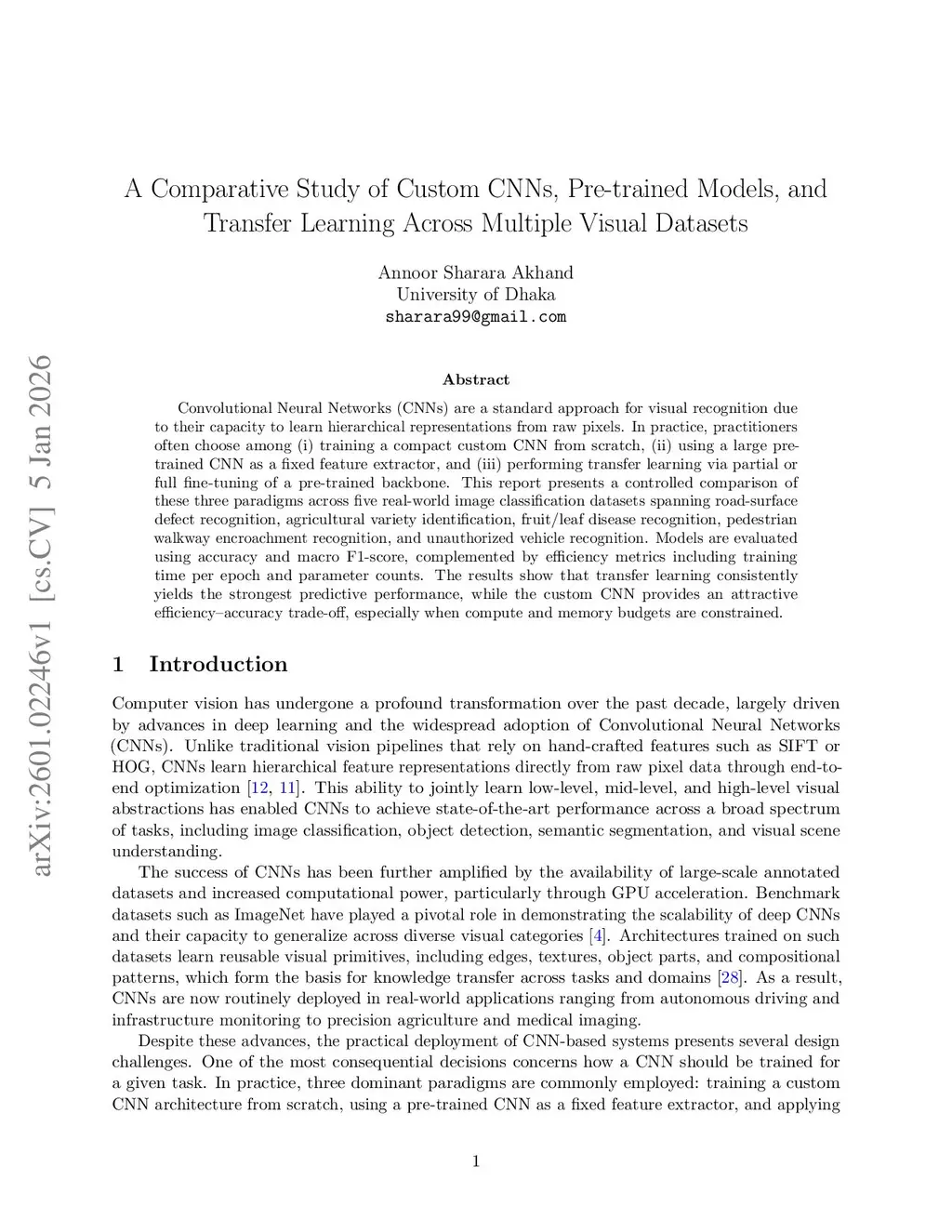 Convolutional Neural Networks (CNNs) are a standard approach for visual recognition due to their capacity to learn hierarchical representations from raw pixels. In practice, practitioners often choose among (i) training a compact custom CNN from scratch, (ii) using a large pre-trained CNN as a fixed feature extractor, and (iii) performing transfer learning via partial or full fine-tuning of a pre-trained backbone. This report presents a controlled comparison of these three paradigms across five real-world image classification datasets spanning road-surface defect recognition, agricultural variety identification, fruit/leaf disease recognition, pedestrian walkway encroachment recognition, and unauthorized vehicle recognition. Models are evaluated using accuracy and macro F1-score, complemented by efficiency metrics including training time per epoch and parameter counts. The results show that transfer learning consistently yields the strongest predictive performance, while the custom CNN provides an attractive efficiency--accuracy trade-off, especially when compute and memory budgets are constrained.