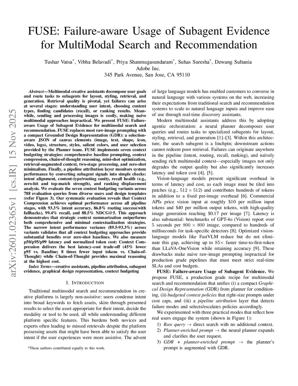 Multimodal creative assistants decompose user goals and route tasks to subagents for layout, styling, retrieval, and generation. Retrieval quality is pivotal, yet failures can arise at several stages: understanding user intent, choosing content types, finding candidates (recall), or ranking results. Meanwhile, sending and processing images is costly, making naive multimodal approaches impractical. We present FUSE: Failure-aware Usage of Subagent Evidence for MultiModal Search and Recommendation. FUSE replaces most raw-image prompting with a compact Grounded Design Representation (GDR): a selection aware JSON of canvas elements (image, text, shape, icon, video, logo), structure, styles, salient colors, and user selection provided by the Planner team. FUSE implements seven context budgeting strategies: comprehensive baseline prompting, context compression, chain-of-thought reasoning, mini-shot optimization, retrieval-augmented context, two-stage processing, and zero-shot minimalism. Finally, a pipeline attribution layer monitors system performance by converting subagent signals into simple checks: intent alignment, content-type/routing sanity, recall health (e.g., zero-hit and top-match strength), and ranking displacement analysis. We evaluate the seven context budgeting variants across 788 evaluation queries from diverse users and design templates (refer Figure 3). Our systematic evaluation reveals that Context Compression achieves optimal performance across all pipeline stages, with 93.3% intent accuracy, 86.8% routing success(with fallbacks), 99.4% recall, and 88.5% NDCG@5. This approach demonstrates that strategic context summarization outperforms both comprehensive and minimal contextualization strategies.