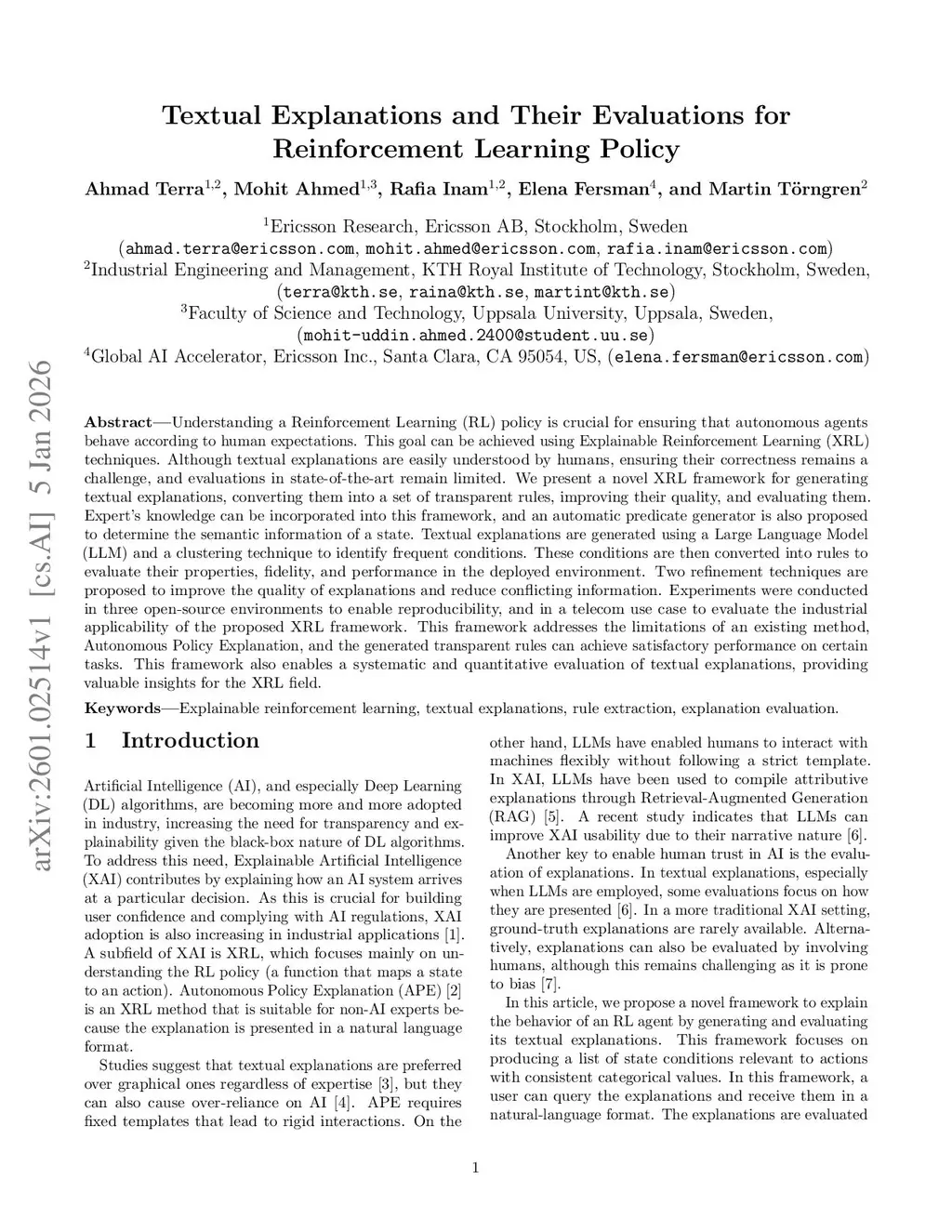 Understanding a Reinforcement Learning (RL) policy is crucial for ensuring that autonomous agents behave according to human expectations. This goal can be achieved using Explainable Reinforcement Learning (XRL) techniques. Although textual explanations are easily understood by humans, ensuring their correctness remains a challenge, and evaluations in state-of-the-art remain limited. We present a novel XRL framework for generating textual explanations, converting them into a set of transparent rules, improving their quality, and evaluating them. Expert's knowledge can be incorporated into this framework, and an automatic predicate generator is also proposed to determine the semantic information of a state. Textual explanations are generated using a Large Language Model (LLM) and a clustering technique to identify frequent conditions. These conditions are then converted into rules to evaluate their properties, fidelity, and performance in the deployed environment. Two refinement techniques are proposed to improve the quality of explanations and reduce conflicting information. Experiments were conducted in three open-source environments to enable reproducibility, and in a telecom use case to evaluate the industrial applicability of the proposed XRL framework. This framework addresses the limitations of an existing method, Autonomous Policy Explanation, and the generated transparent rules can achieve satisfactory performance on certain tasks. This framework also enables a systematic and quantitative evaluation of textual explanations, providing valuable insights for the XRL field.