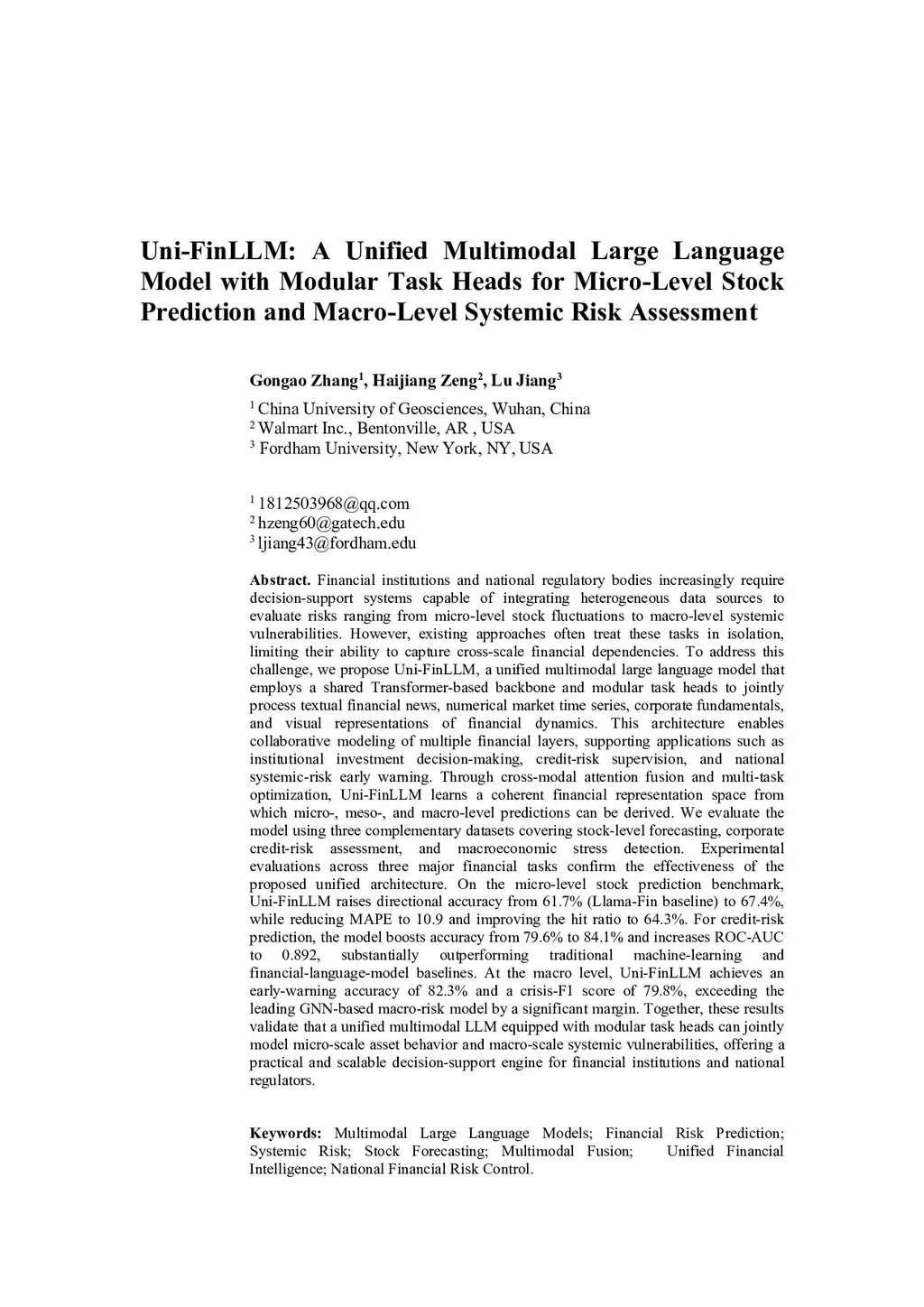 Financial institutions and regulators require systems that integrate heterogeneous data to assess risks from stock fluctuations to systemic vulnerabilities. Existing approaches often treat these tasks in isolation, failing to capture cross-scale dependencies. We propose Uni-FinLLM, a unified multimodal large language model that uses a shared Transformer backbone and modular task heads to jointly process financial text, numerical time series, fundamentals, and visual data. Through cross-modal attention and multi-task optimization, it learns a coherent representation for micro-, meso-, and macro-level predictions. Evaluated on stock forecasting, credit-risk assessment, and systemic-risk detection, Uni-FinLLM significantly outperforms baselines. It raises stock directional accuracy to 67.4% (from 61.7%), credit-risk accuracy to 84.1% (from 79.6%), and macro early-warning accuracy to 82.3%. Results validate that a unified multimodal LLM can jointly model asset behavior and systemic vulnerabilities, offering a scalable decision-support engine for finance.