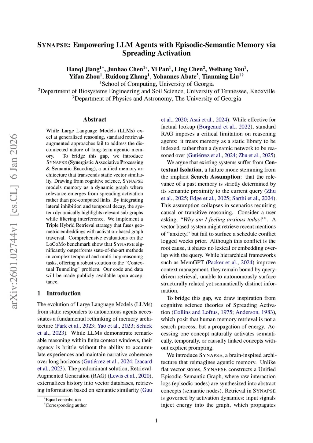 While Large Language Models (LLMs) excel at generalized reasoning, standard retrieval-augmented approaches fail to address the disconnected nature of long-term agentic memory. To bridge this gap, we introduce Synapse (Synergistic Associative Processing Semantic Encoding), a unified memory architecture that transcends static vector similarity. Drawing from cognitive science, Synapse models memory as a dynamic graph where relevance emerges from spreading activation rather than pre-computed links. By integrating lateral inhibition and temporal decay, the system dynamically highlights relevant sub-graphs while filtering interference. We implement a Triple Hybrid Retrieval strategy that fuses geometric embeddings with activation-based graph traversal. Comprehensive evaluations on the LoCoMo benchmark show that Synapse significantly outperforms state-of-the-art methods in complex temporal and multi-hop reasoning tasks, offering a robust solution to the "Contextual Tunneling" problem. Our code and data will be made publicly available upon acceptance.