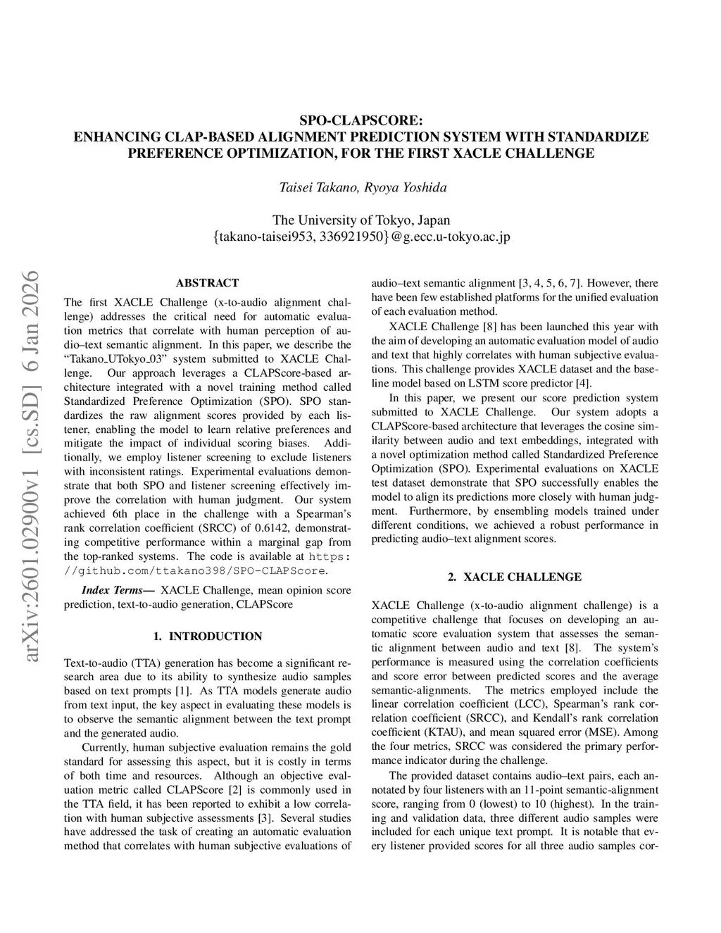 The first XACLE Challenge (x-to-audio alignment challenge) addresses the critical need for automatic evaluation metrics that correlate with human perception of audio-text semantic alignment. In this paper, we describe the "Takano_UTokyo_03" system submitted to XACLE Challenge. Our approach leverages a CLAPScore-based architecture integrated with a novel training method called Standardized Preference Optimization (SPO). SPO standardizes the raw alignment scores provided by each listener, enabling the model to learn relative preferences and mitigate the impact of individual scoring biases. Additionally, we employ listener screening to exclude listeners with inconsistent ratings. Experimental evaluations demonstrate that both SPO and listener screening effectively improve the correlation with human judgment. Our system achieved 6th place in the challenge with a Spearman's rank correlation coefficient (SRCC) of 0.6142, demonstrating competitive performance within a marginal gap from the top-ranked systems. The code is available atthis https URL.