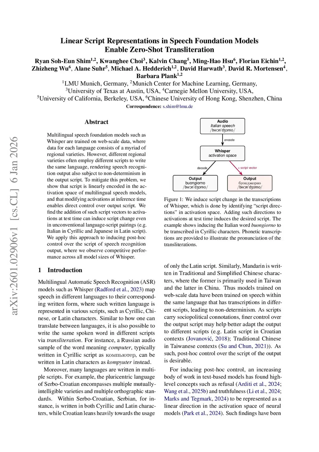 Multilingual speech foundation models such as Whisper are trained on web-scale data, where data for each language consists of a myriad of regional varieties. However, different regional varieties often employ different scripts to write the same language, rendering speech recognition output also subject to non-determinism in the output script. To mitigate this problem, we show that script is linearly encoded in the activation space of multilingual speech models, and that modifying activations at inference time enables direct control over output script. We find the addition of such script vectors to activations at test time can induce script change even in unconventional language-script pairings (e.g. Italian in Cyrillic and Japanese in Latin script). We apply this approach to inducing post-hoc control over the script of speech recognition output, where we observe competitive performance across all model sizes of Whisper.